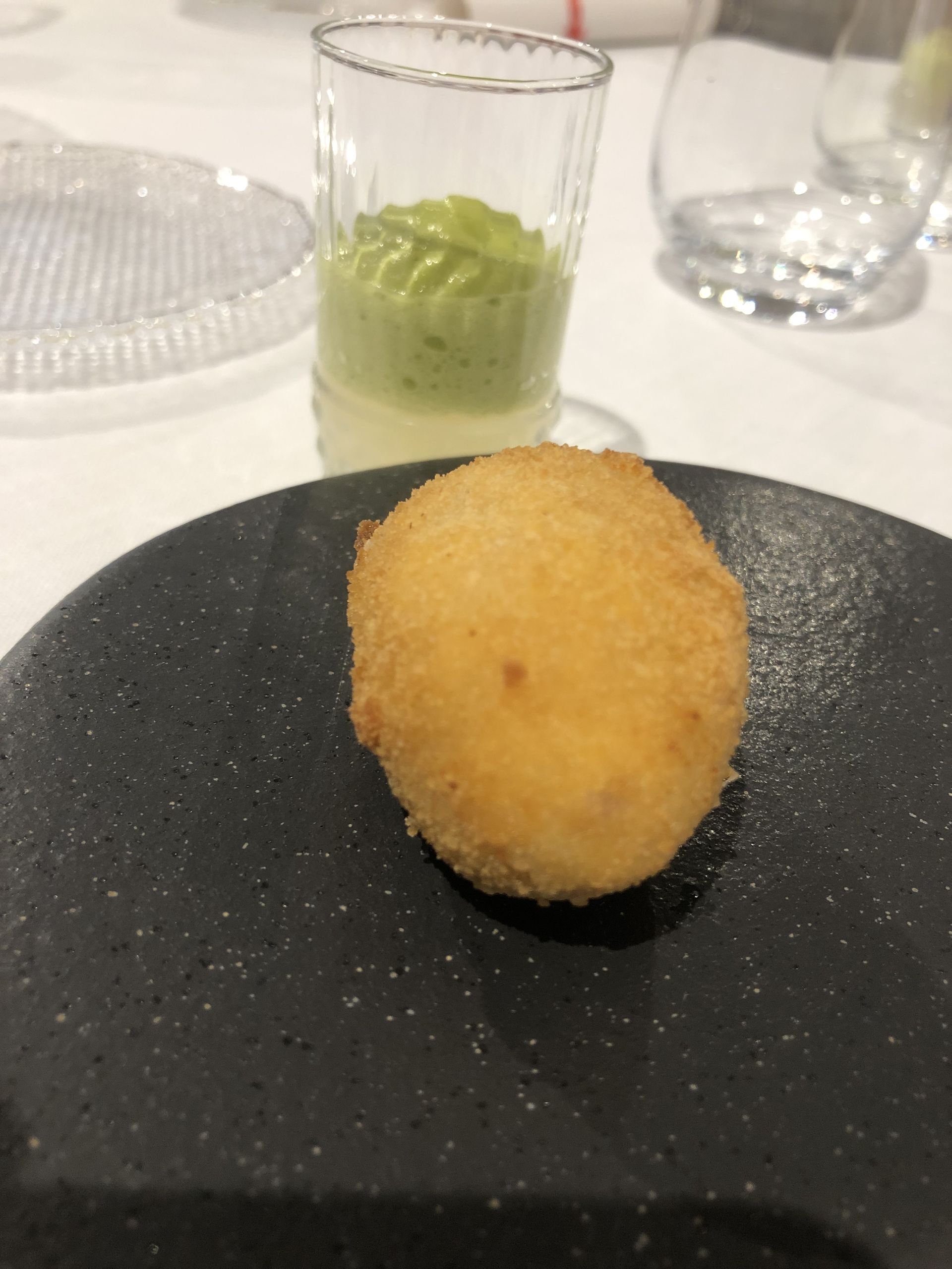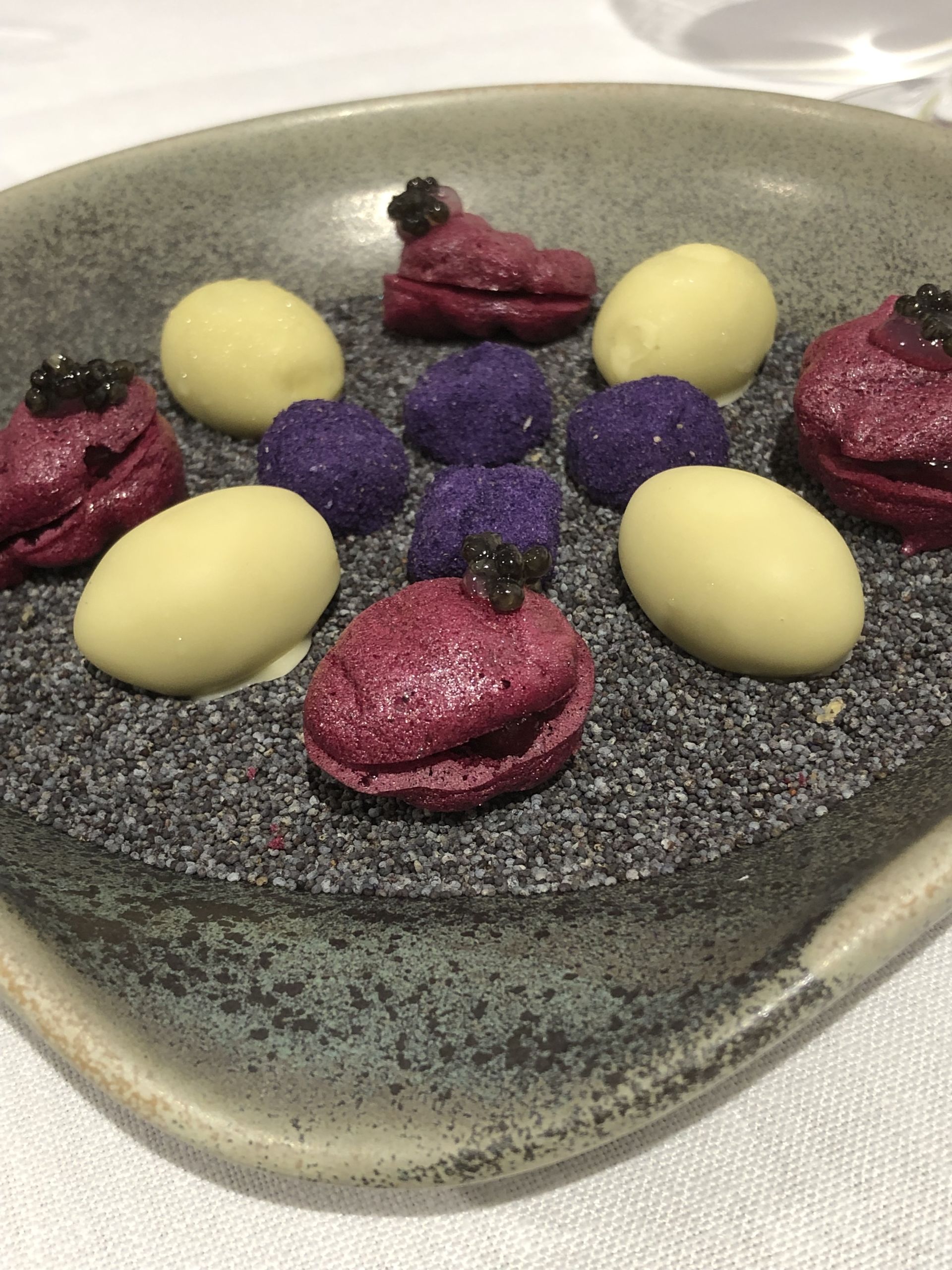 macarron de remolacha con gel de limón y caviar, bolita de queso y lavanda y un mimético de aceituna relleno del aliño que la abuela de Juan Monteagudo usaba en las aceitunas.