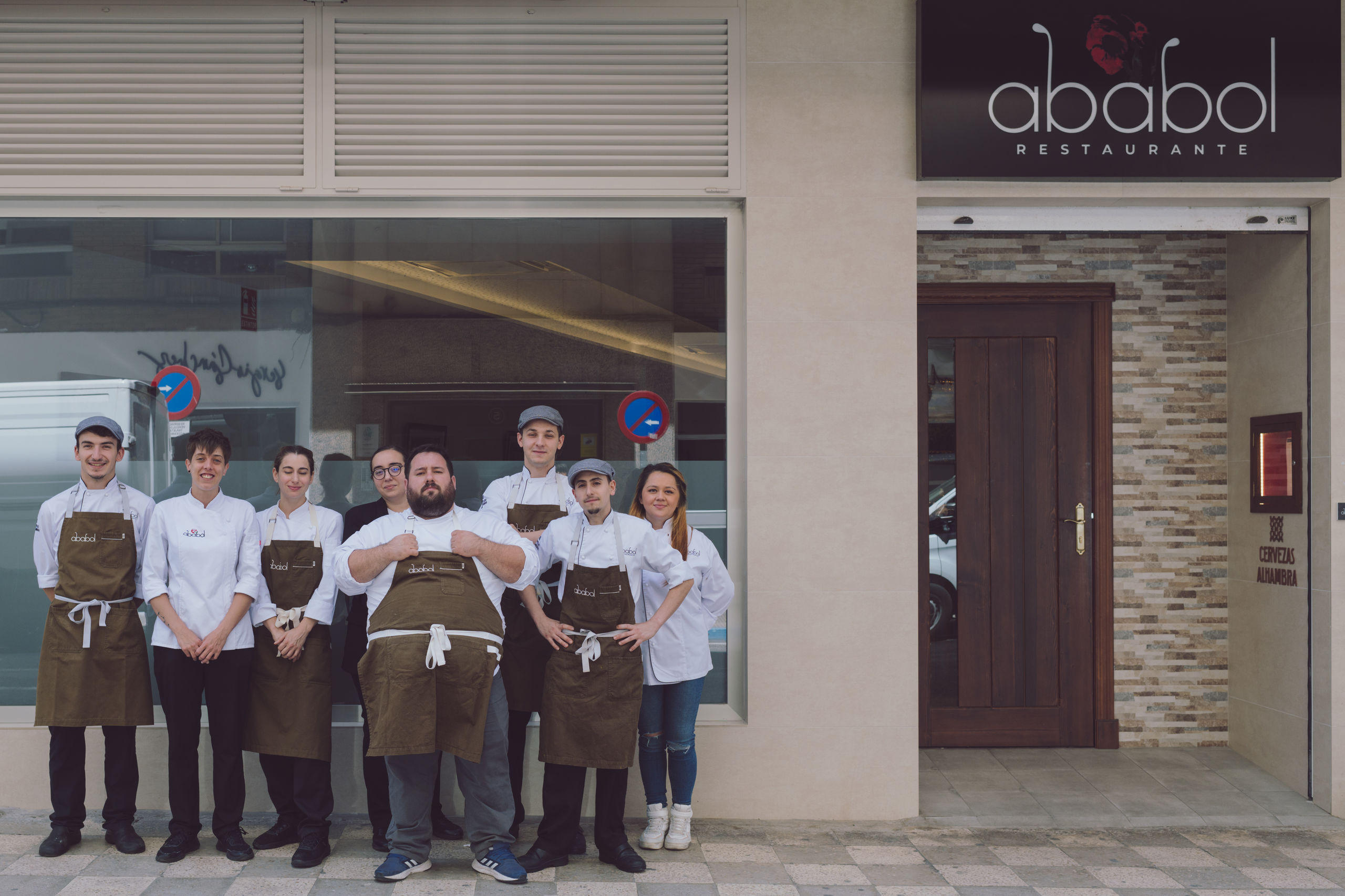 Juan Monteagudo posa con todo su equipo a las puertas del restaurante ubicado en la calle Calderón de la Barca, 14, de Albacete.