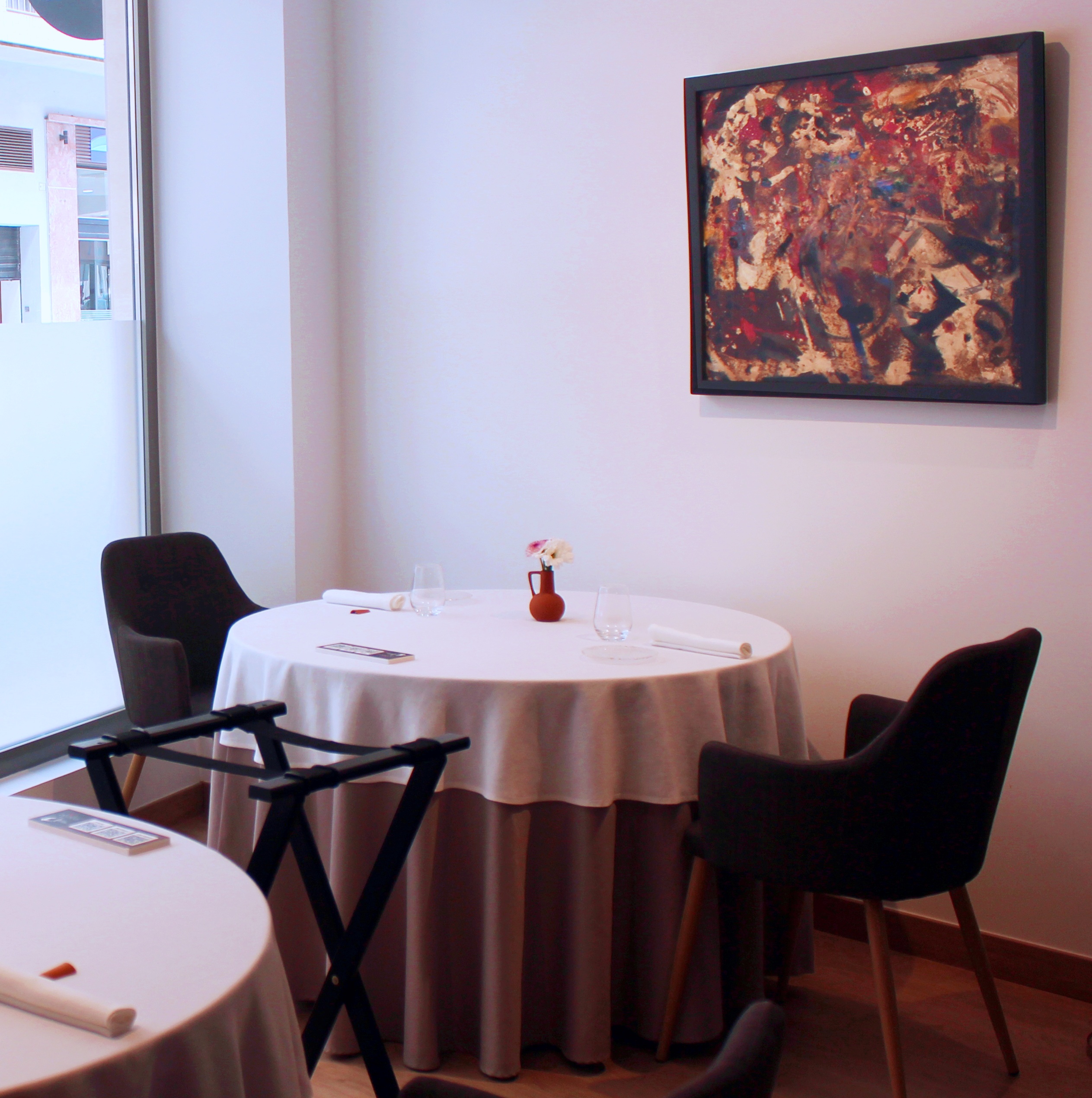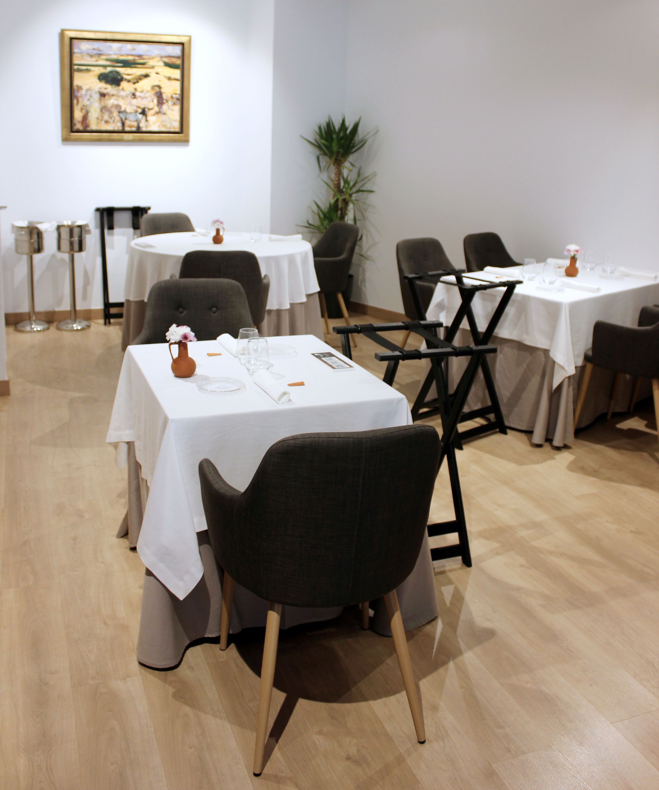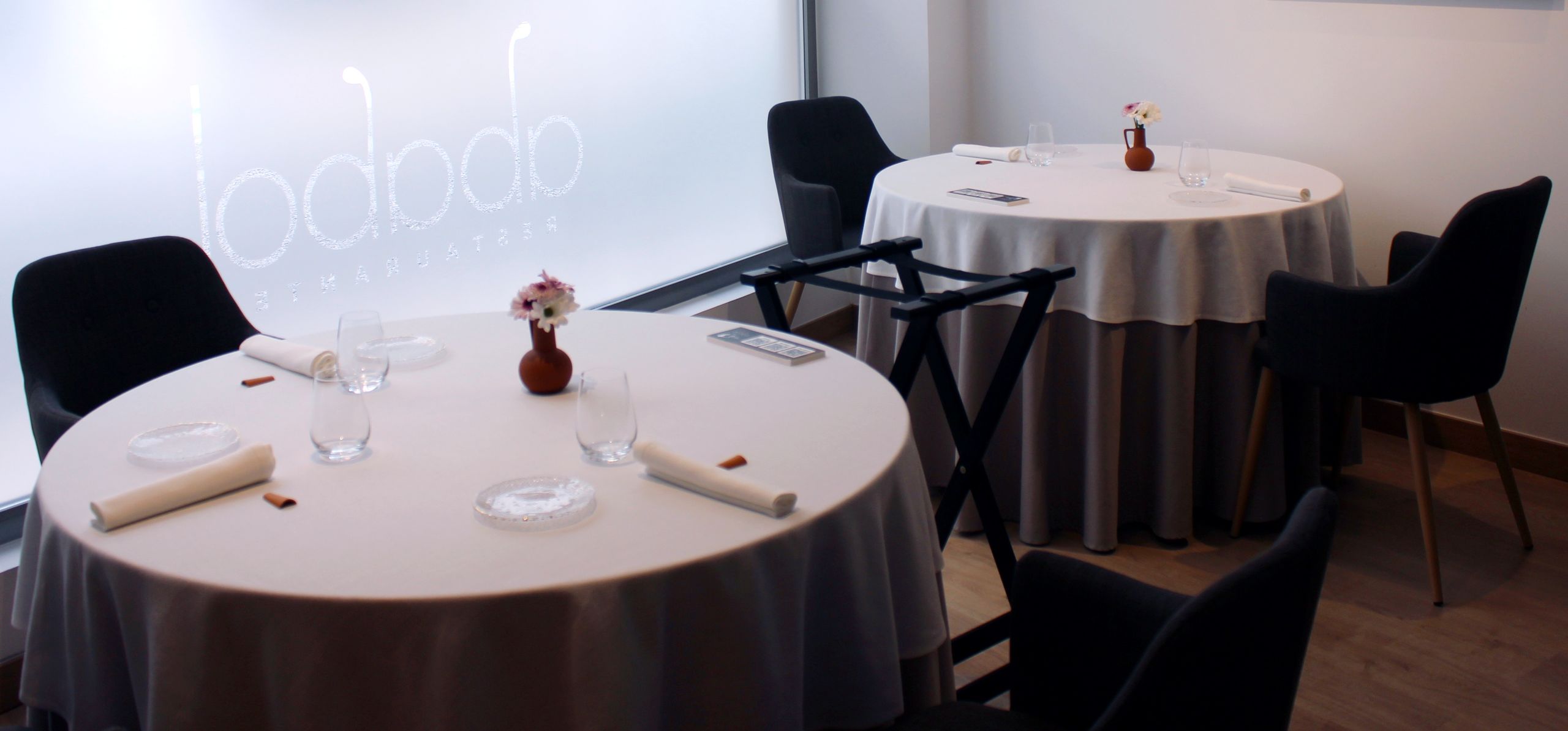 Uno de los rincones del restaurante Ababol con las mesas vestidas con mantel y sobre mantel.