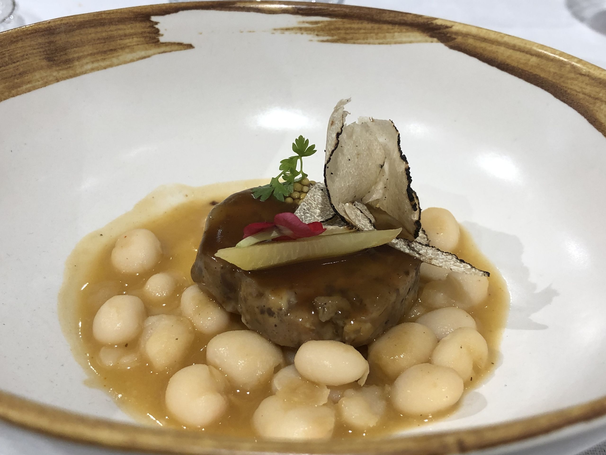 Terrina de perdiz roja de tiro, foie con alubias en escabeche y puma en aguasal.