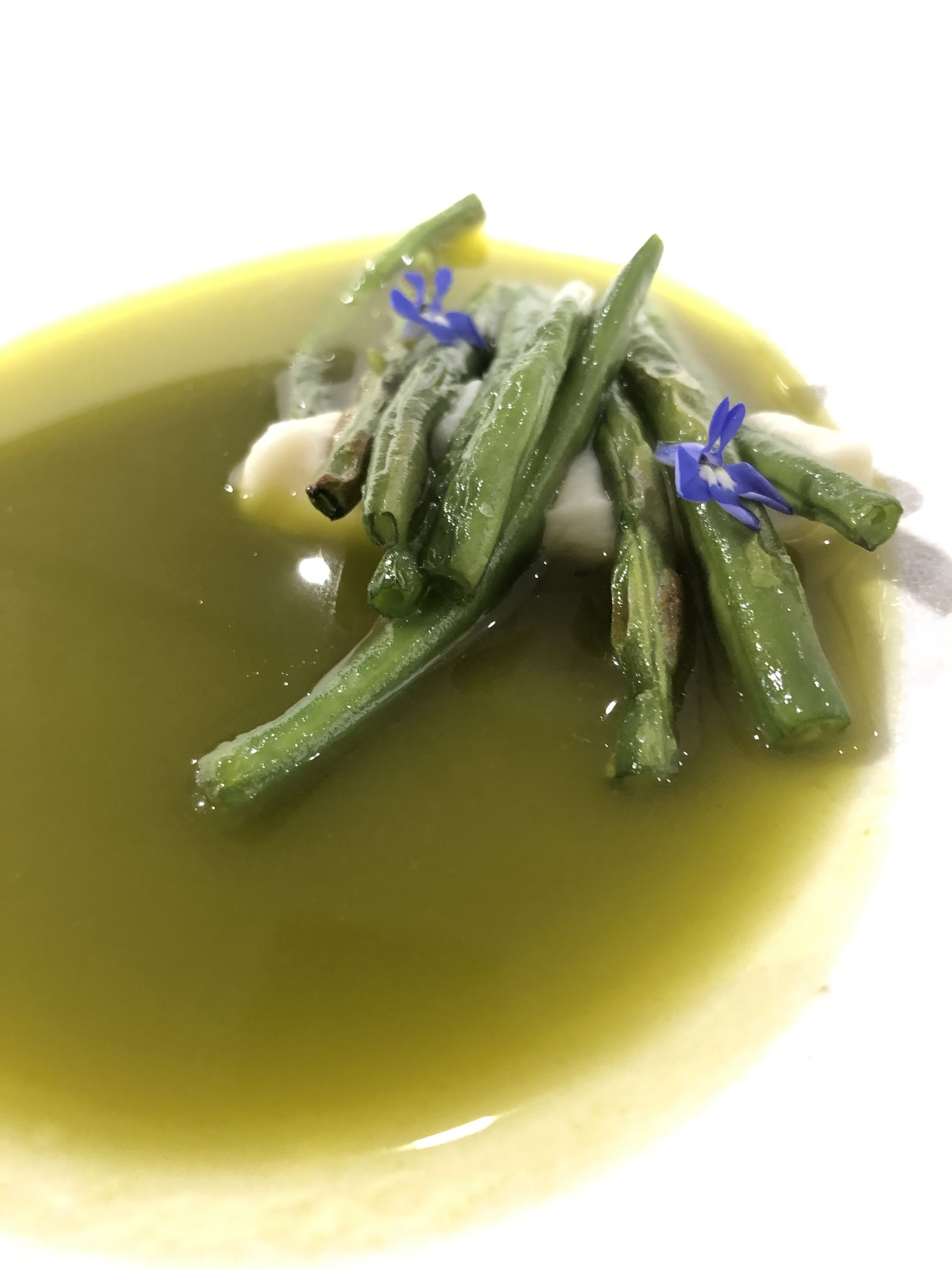 Vainas verdes escaldadas a la brasa, acompañadas de una crema de coliflor y chocolate blanco y con un delicioso caldo elaborado con recortes de las judías y enriquecido con manita de cerdo.