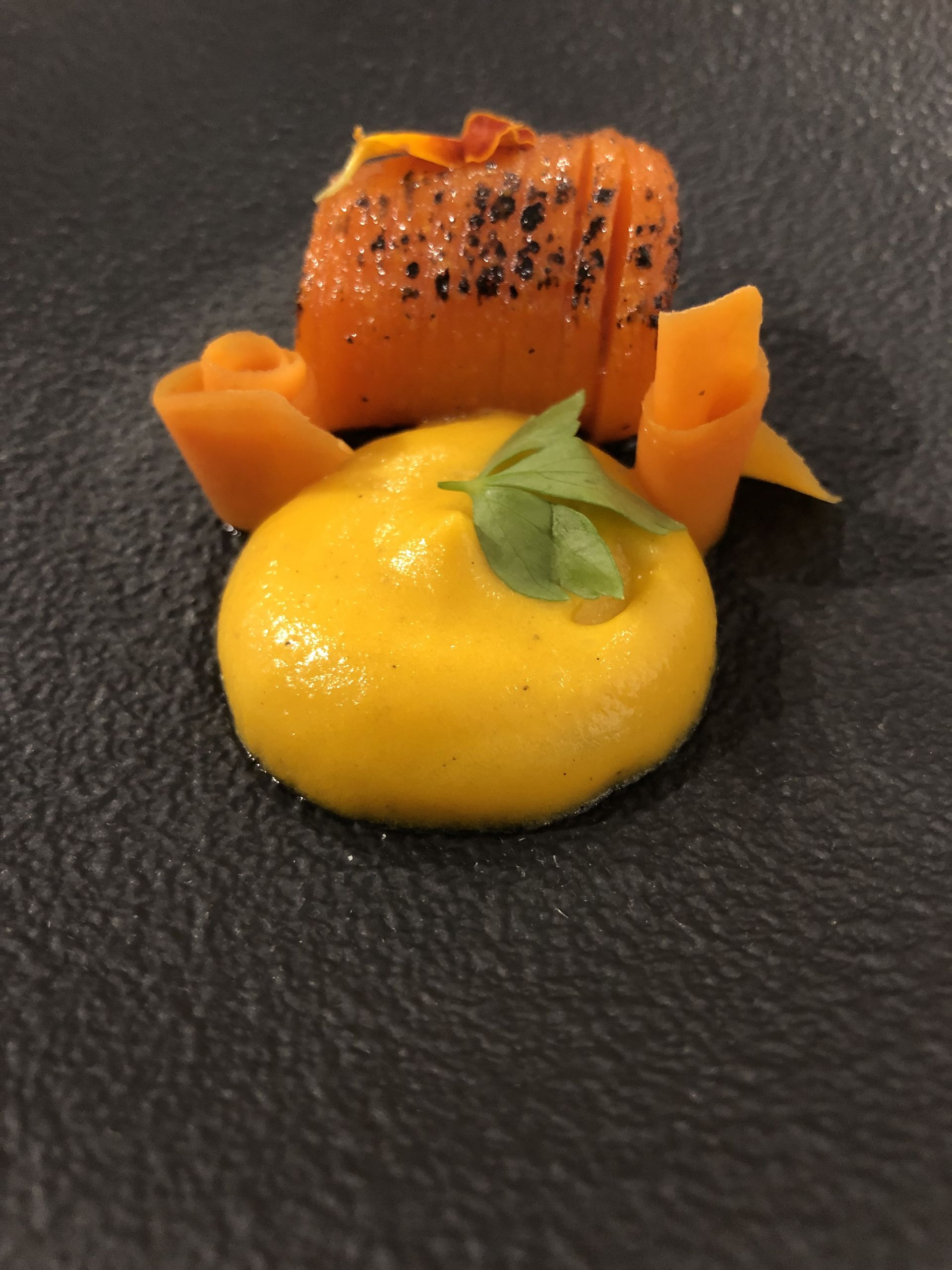 Zanahoria al cubo, con zanahoria a la brasa, crema de zanahoria y unas tiras de zanahoria maceradas en jengibre.