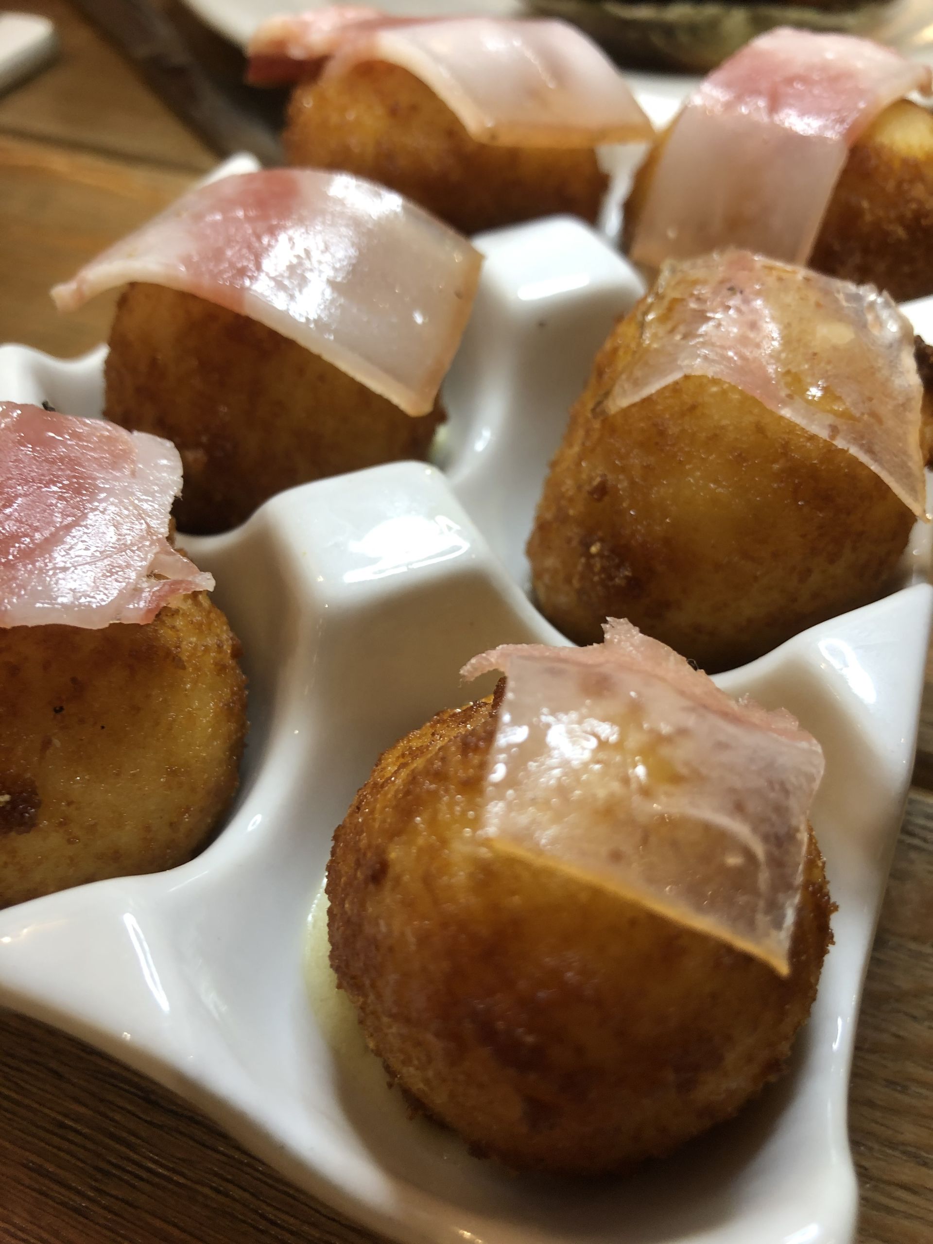 Croquetas de carbonara original con queso Idiazábal y velo de ibérico.
