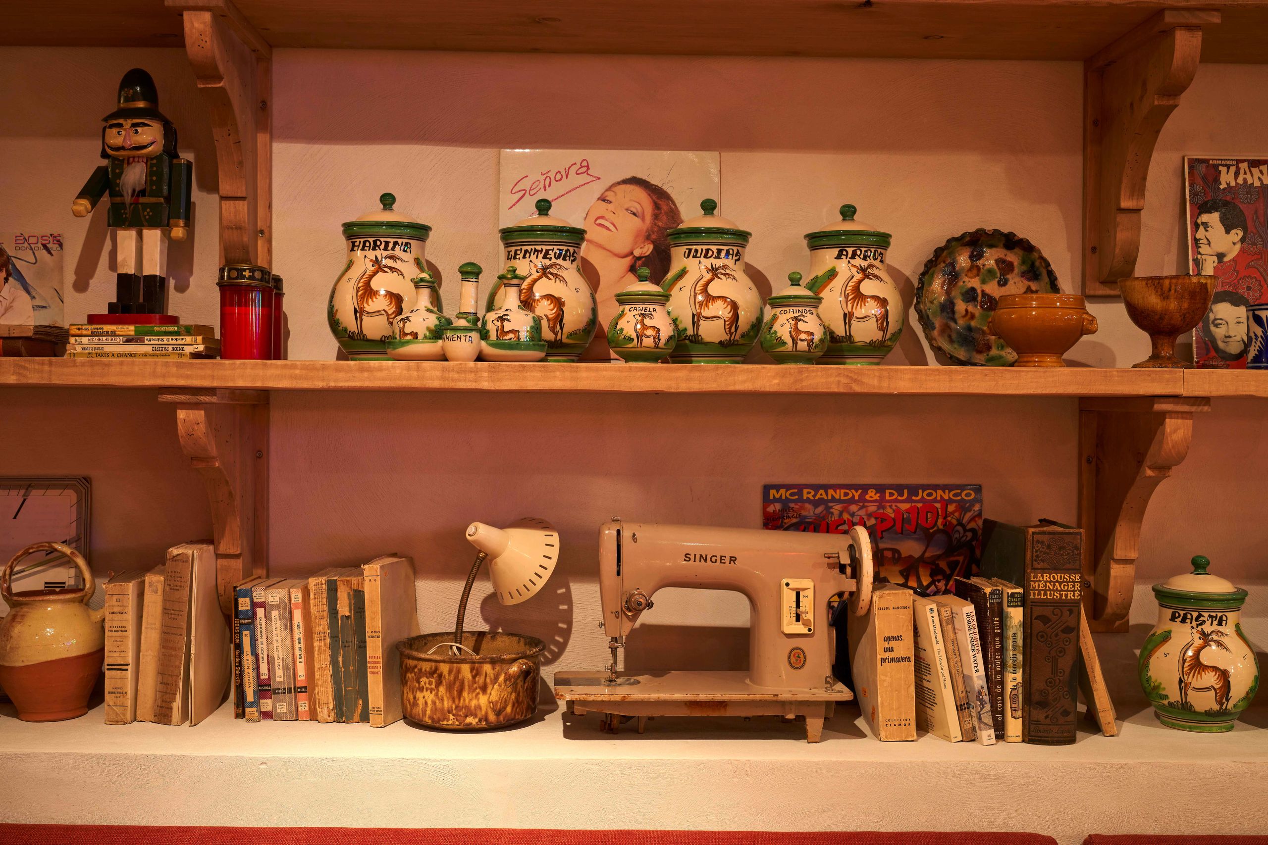 Bibliotecas llenas de libros y elementos vintage y vinilos de la música pop española de épocas pasadas.