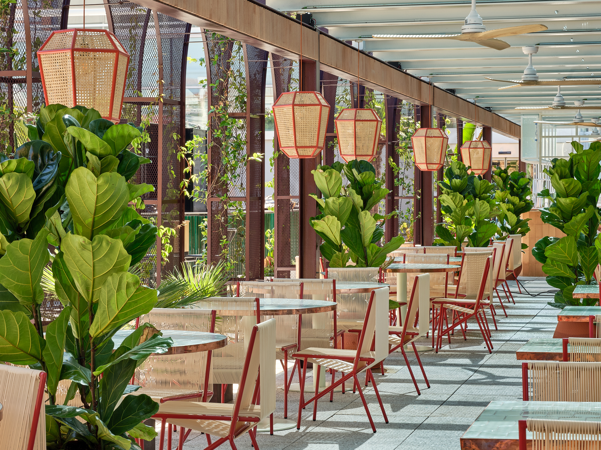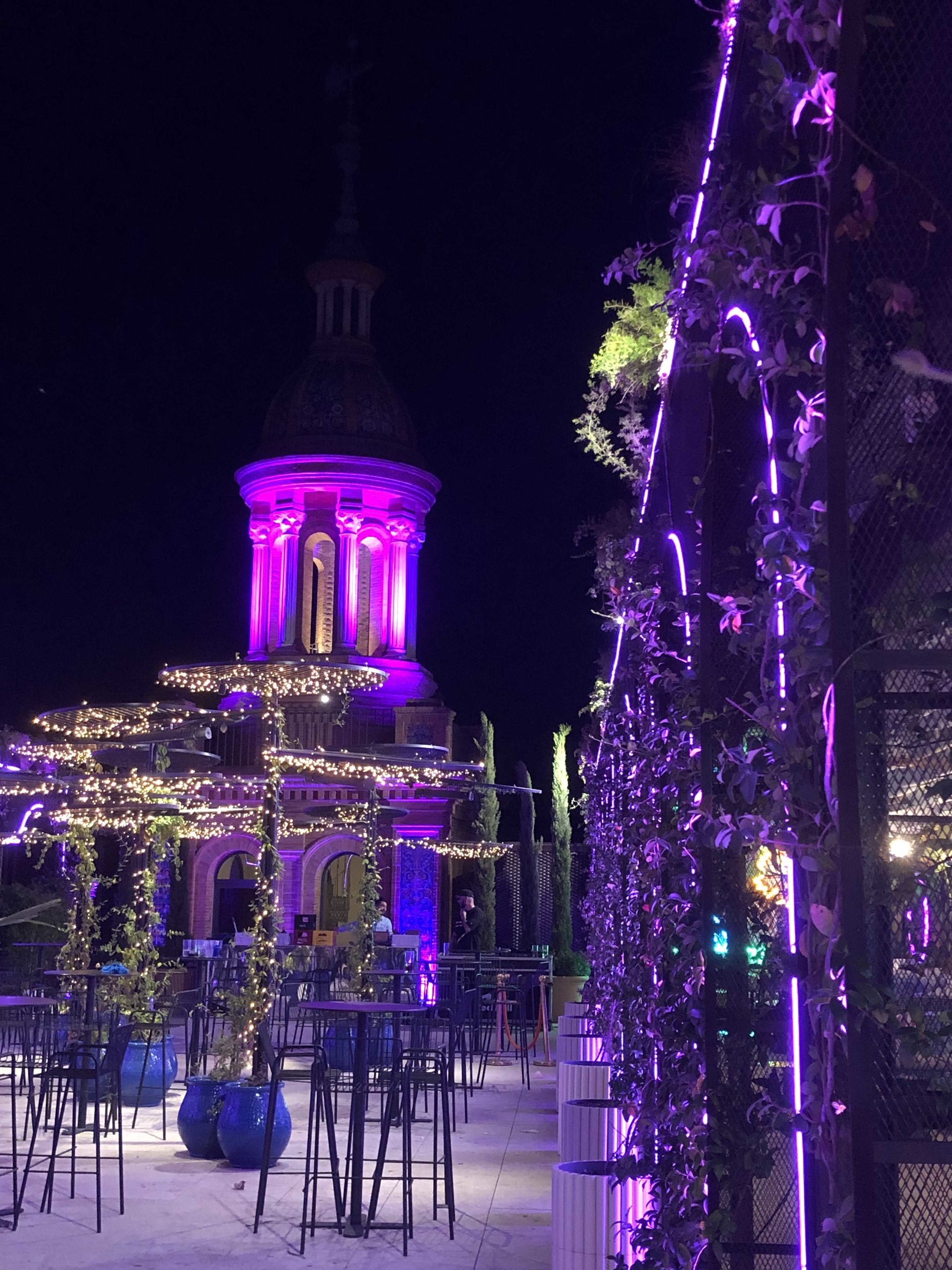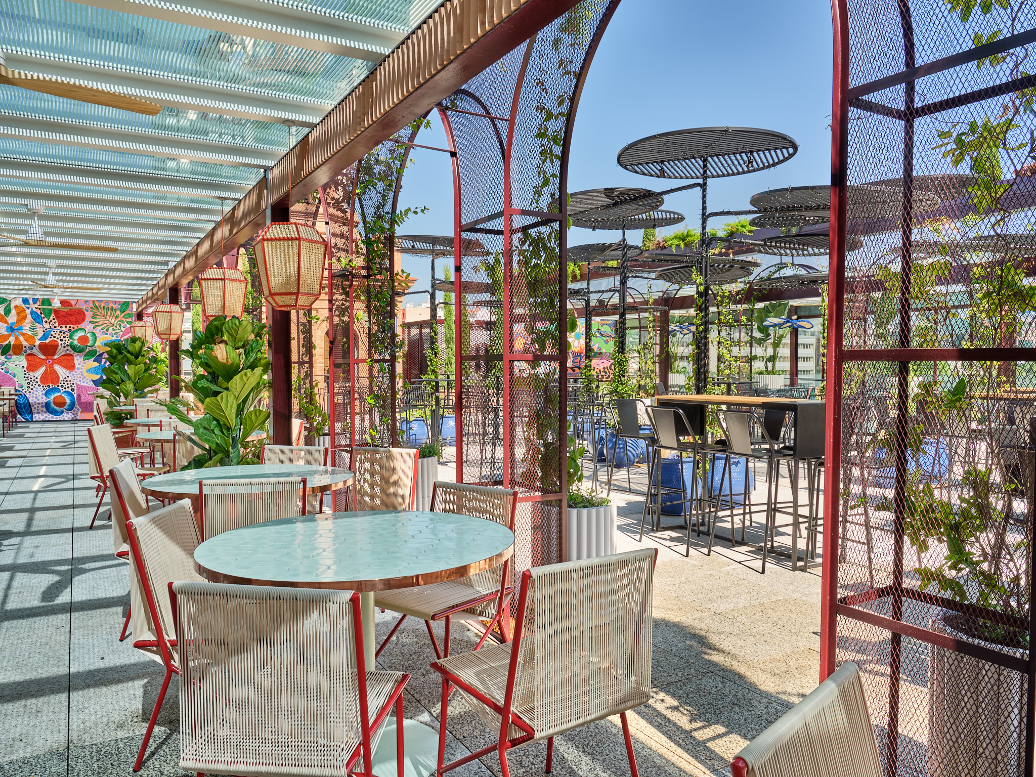 En la icónica terraza Bianca podrás disfrutar de parte de la carta de Torcuato, de una amplia selección de combinados y cócteles para una sobremesa animada por un DJ en un espacio que destaca por un estallido de lo exótico, con muchas plantas –algunas trepadoras– que combinan con los neones y los murales de estilo aborigen y pop.