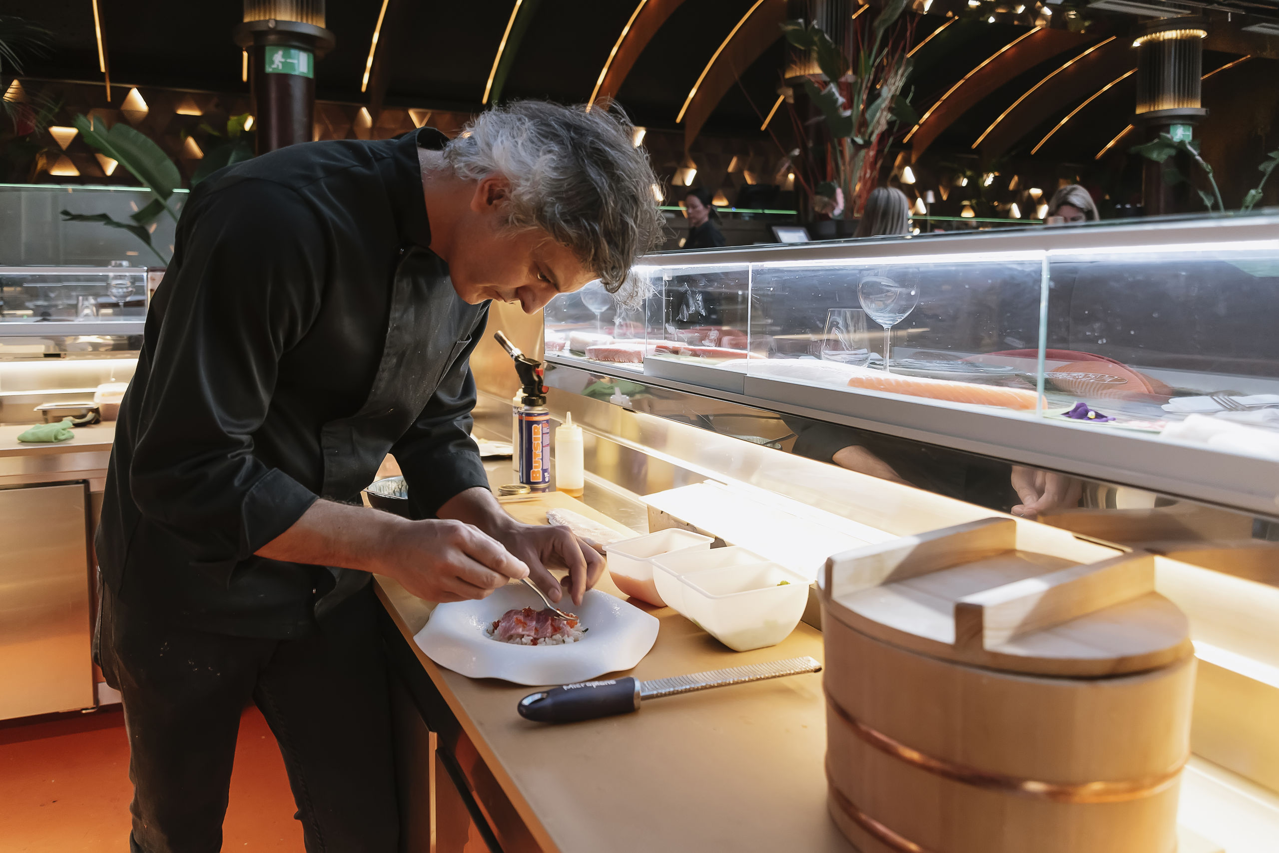 El chef Juan Suárez de Lezo emplata una de sus creaciones en el sushi bar de Quintoelemento.