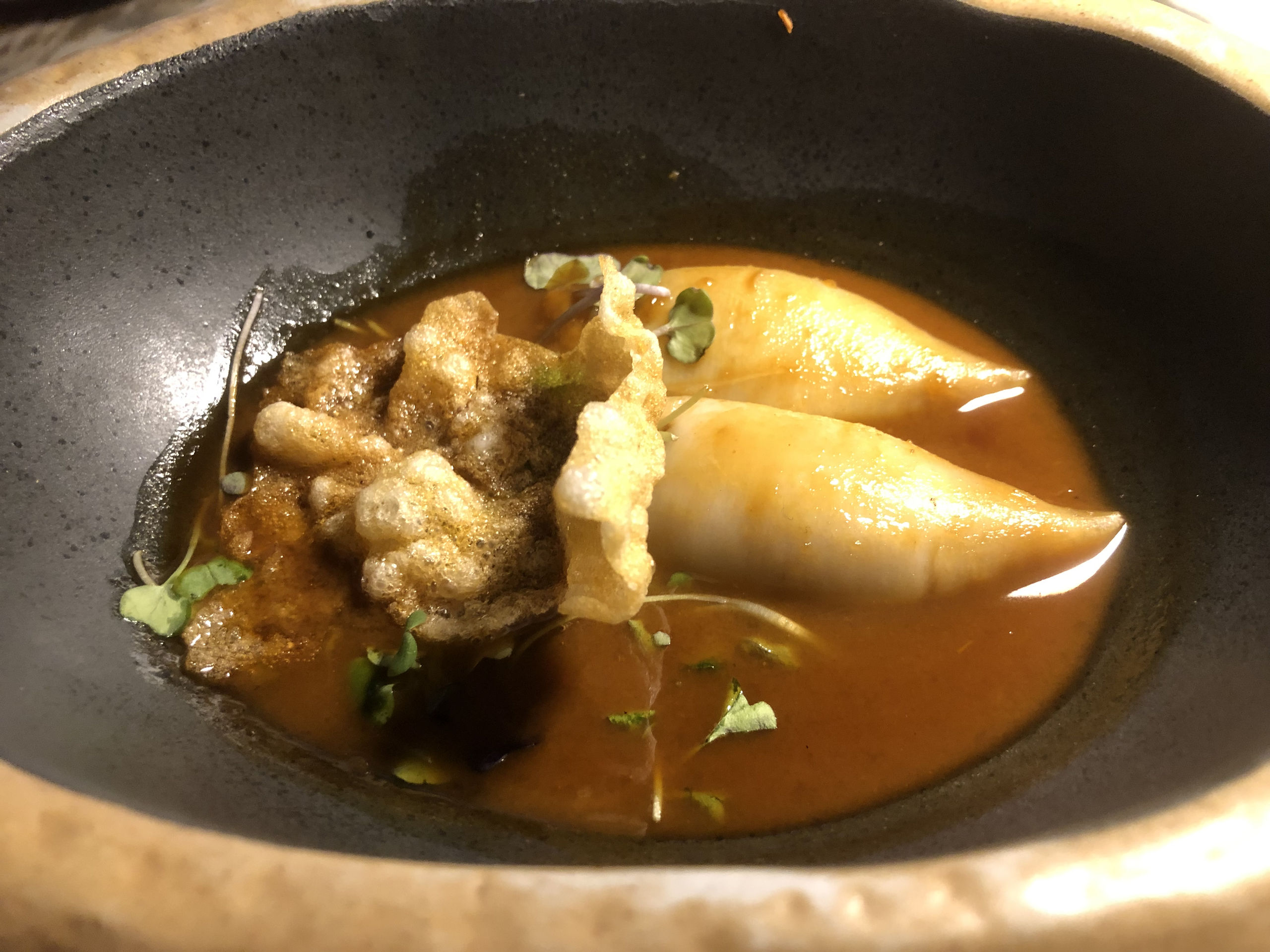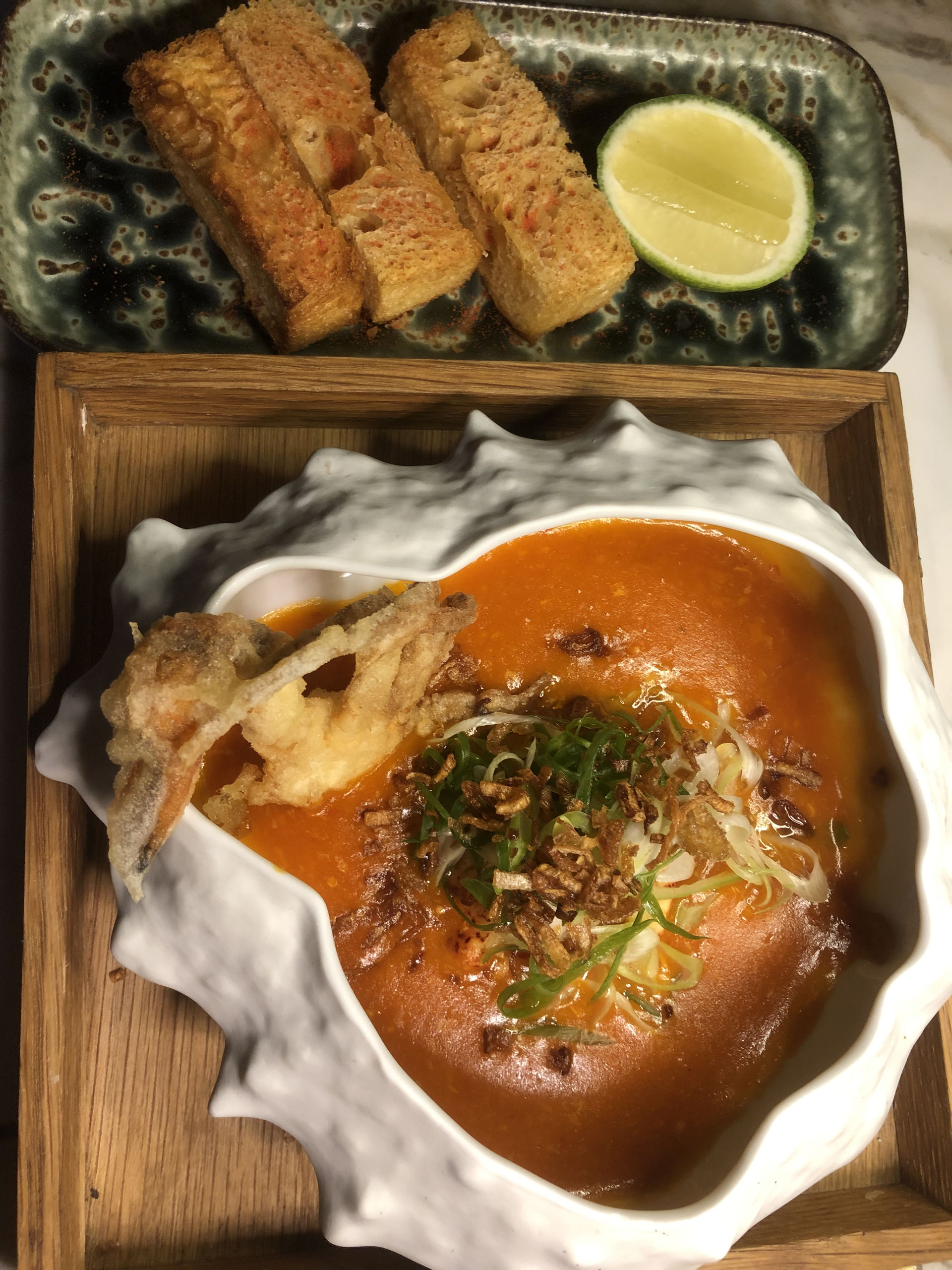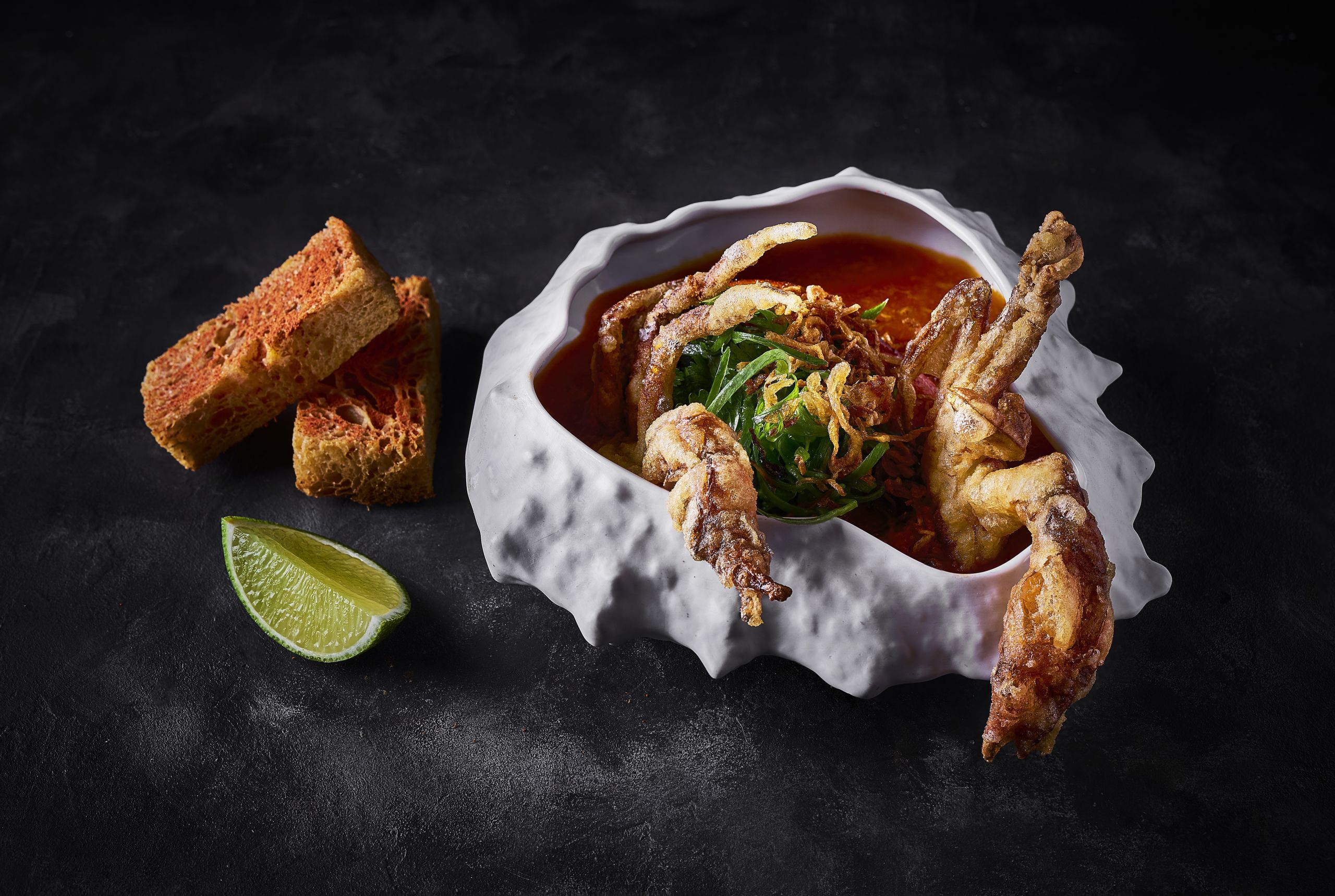 Chili crab del señorito (27€), presentado en un cuenco con forma de centollo, con una salsa de gran sabor a bogavante y con un cangrejo de concha blanda –soft shell crab– para que al mezclarlo consigas el llamado umami, el quinto sabor en Quintoelemento.