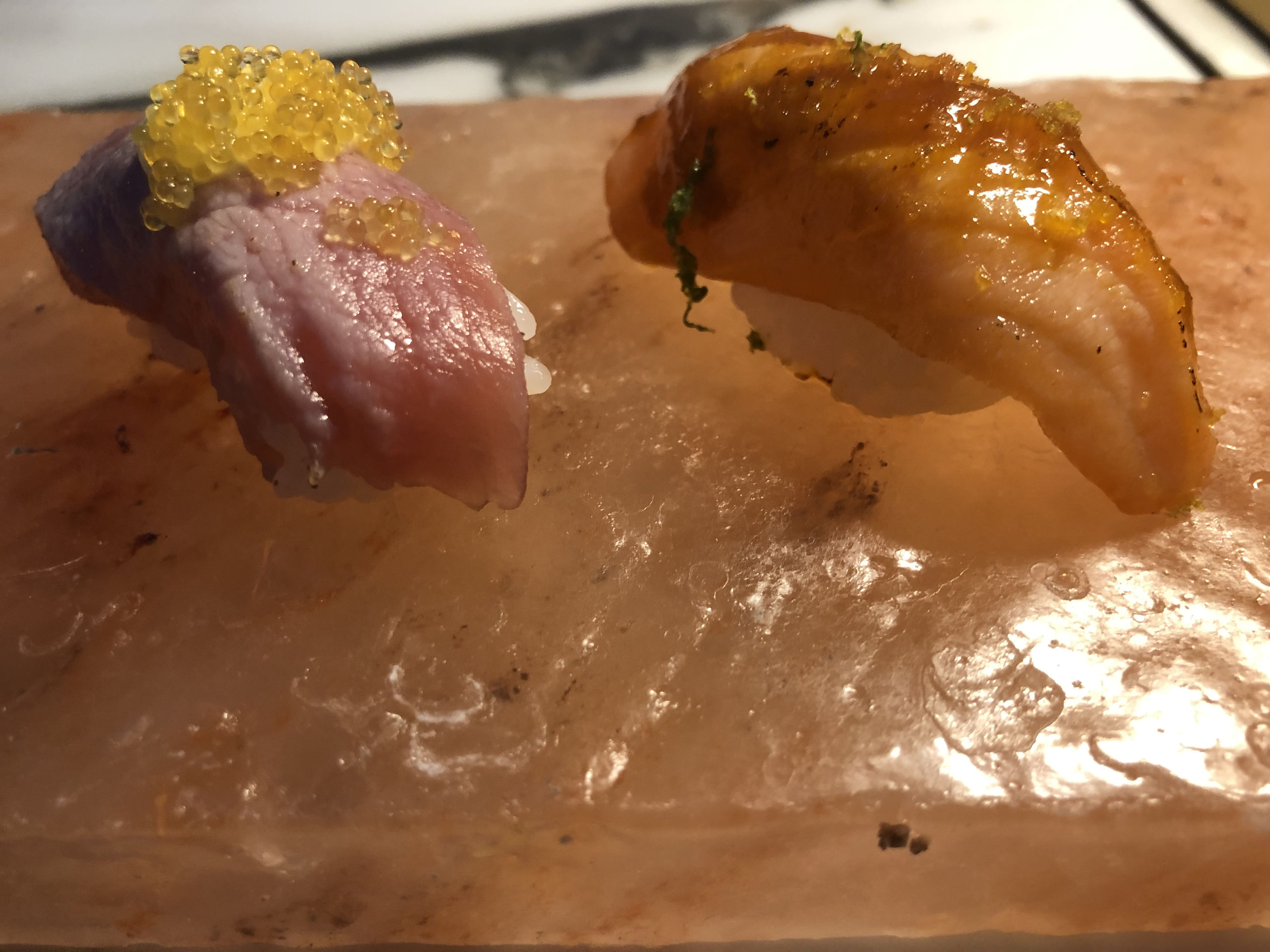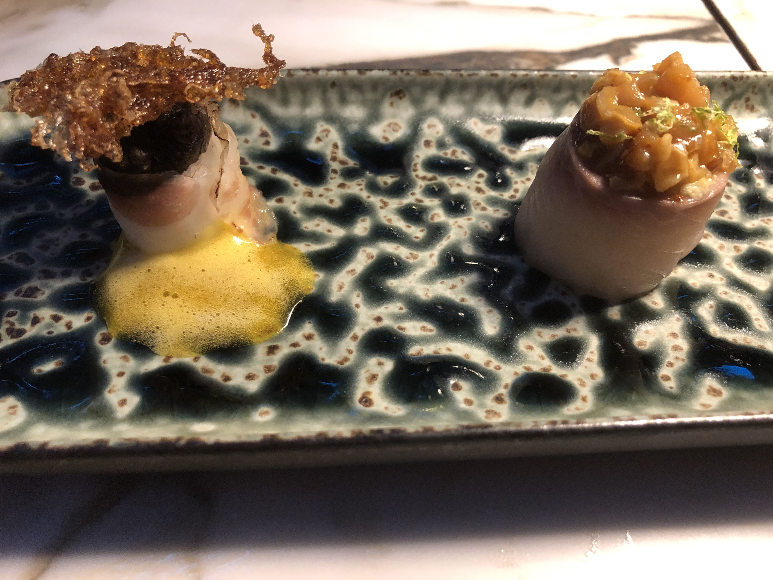 Gunkan de guiso de calamar (10€ / 2 unidades) y gunkan de morcilla y chiles (10€ / 2 unidades), con la yema del huevo y puntillitas.