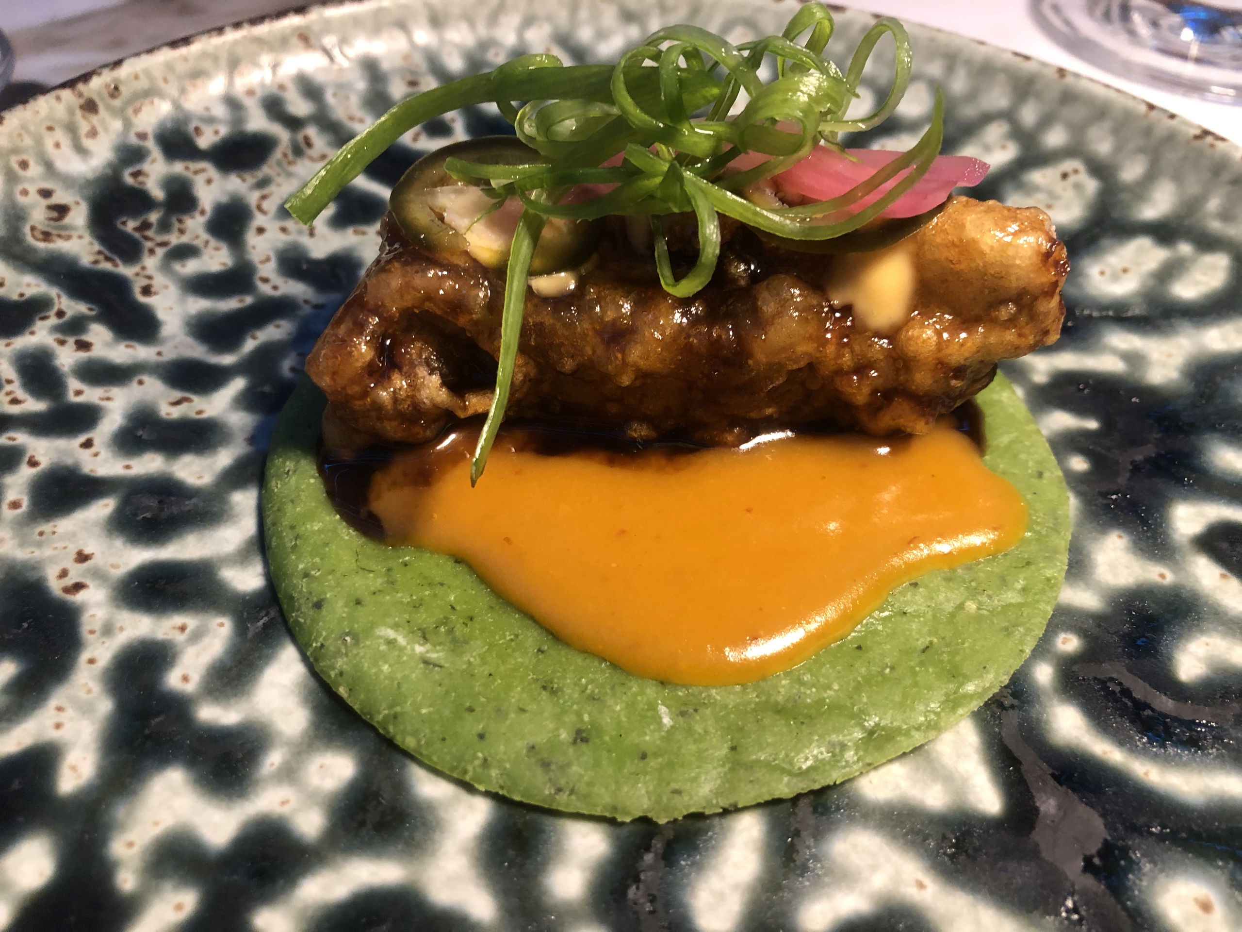 Taco de berenjena (7€ / 2 unidades) en tempura con cebolla encurtida, jalapeño y salsa.