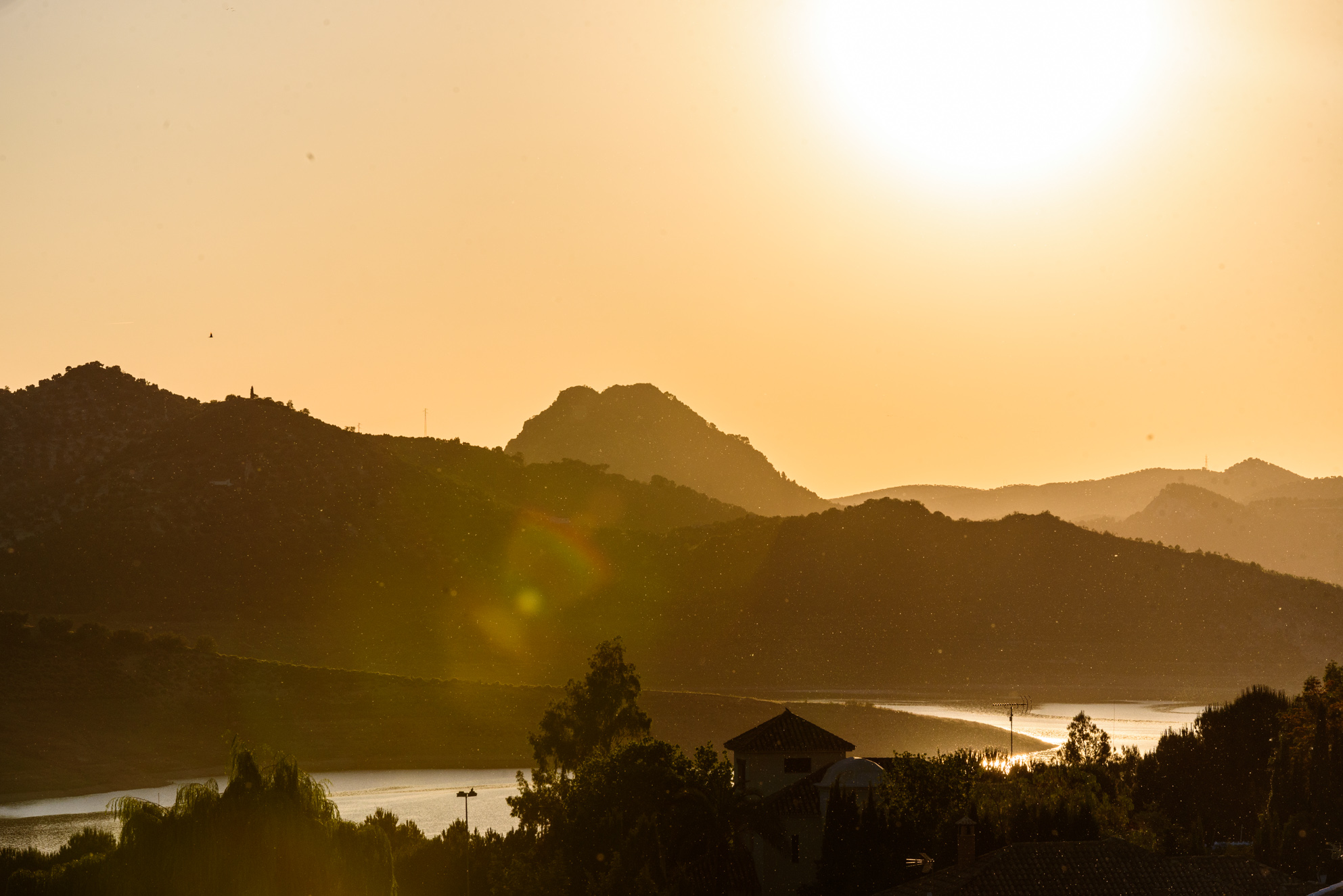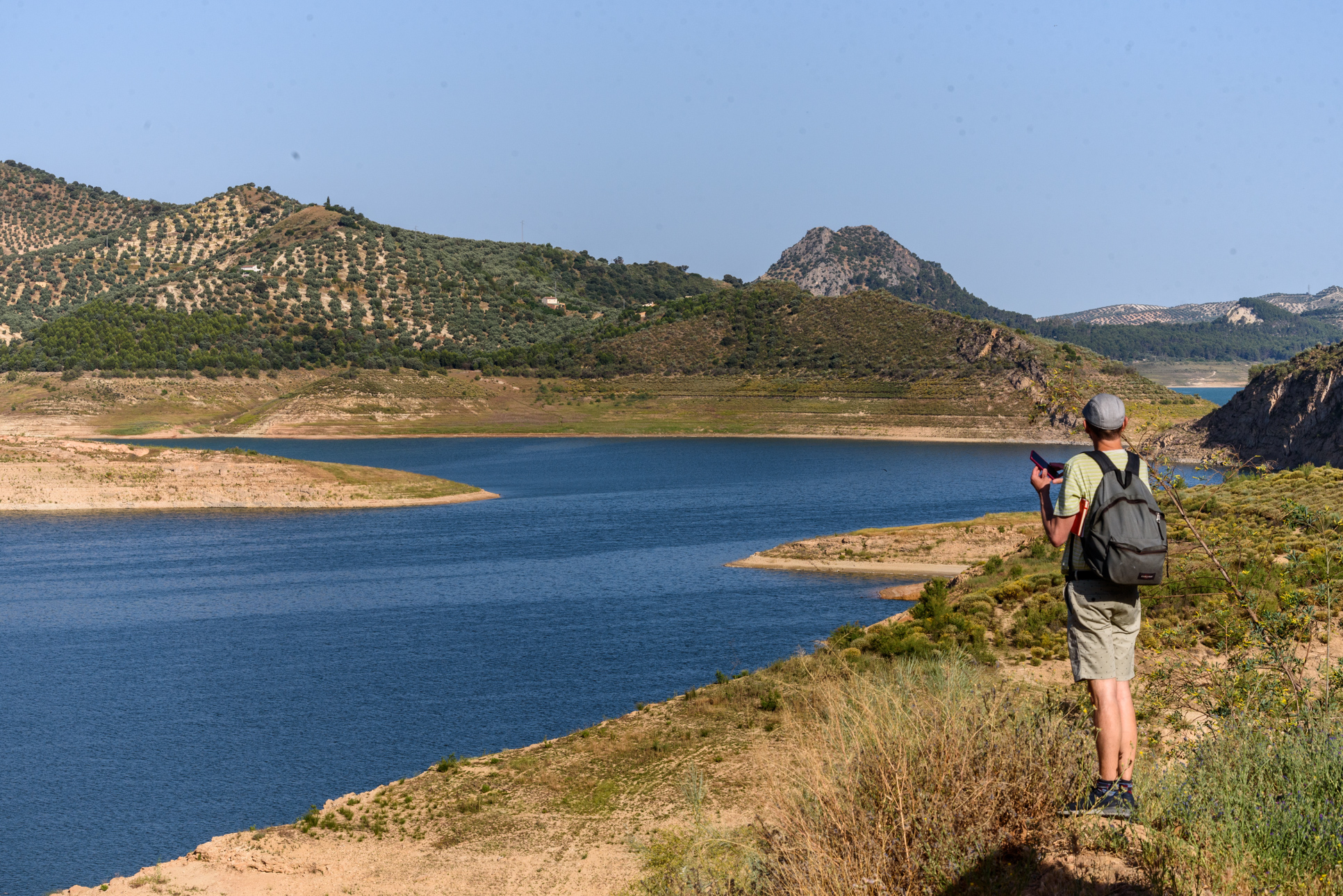 El embalse de Iznájar y los riscos que le rodean un momento al atardecer. El primer día, si el tiempo lo permite y no hay nubes, disfrutar del atardecer mirando hacia el oeste y ver cómo se reflejan los últimos rayos de luz sobre las aguas del embalse, es uno de esos momentos pasajeros que dejarán huella en la memoria viajera del visitante.