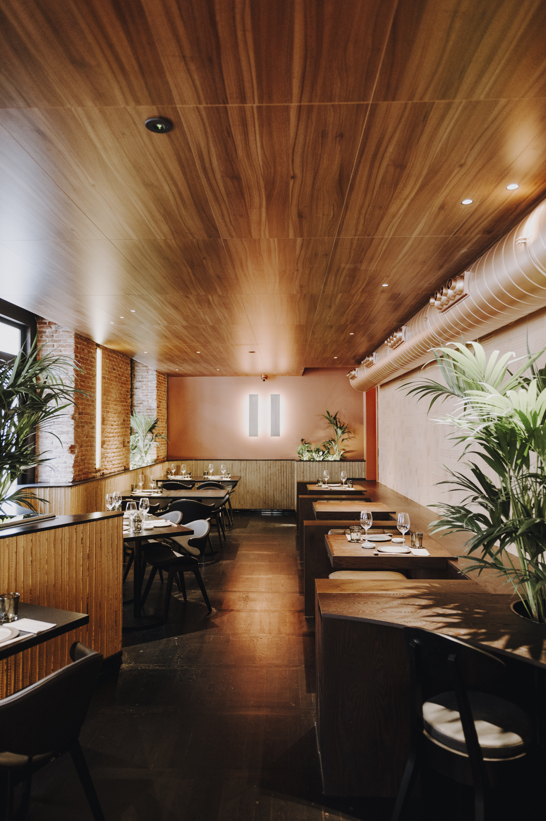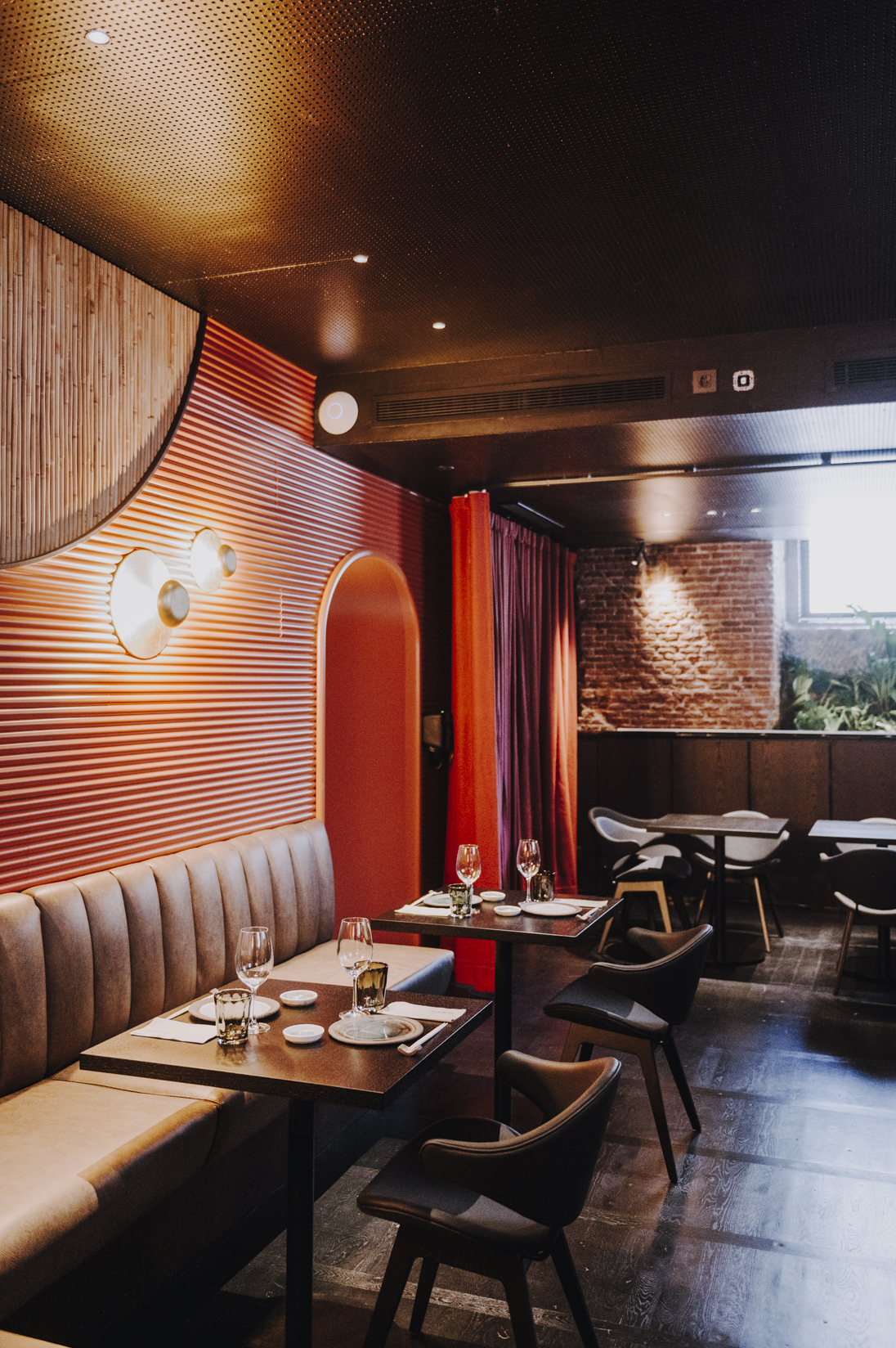 En la planta superior se encuentran las mesas dispuestas en formas orgánicas que envuelven el local y crean diferentes zonas y rincones.