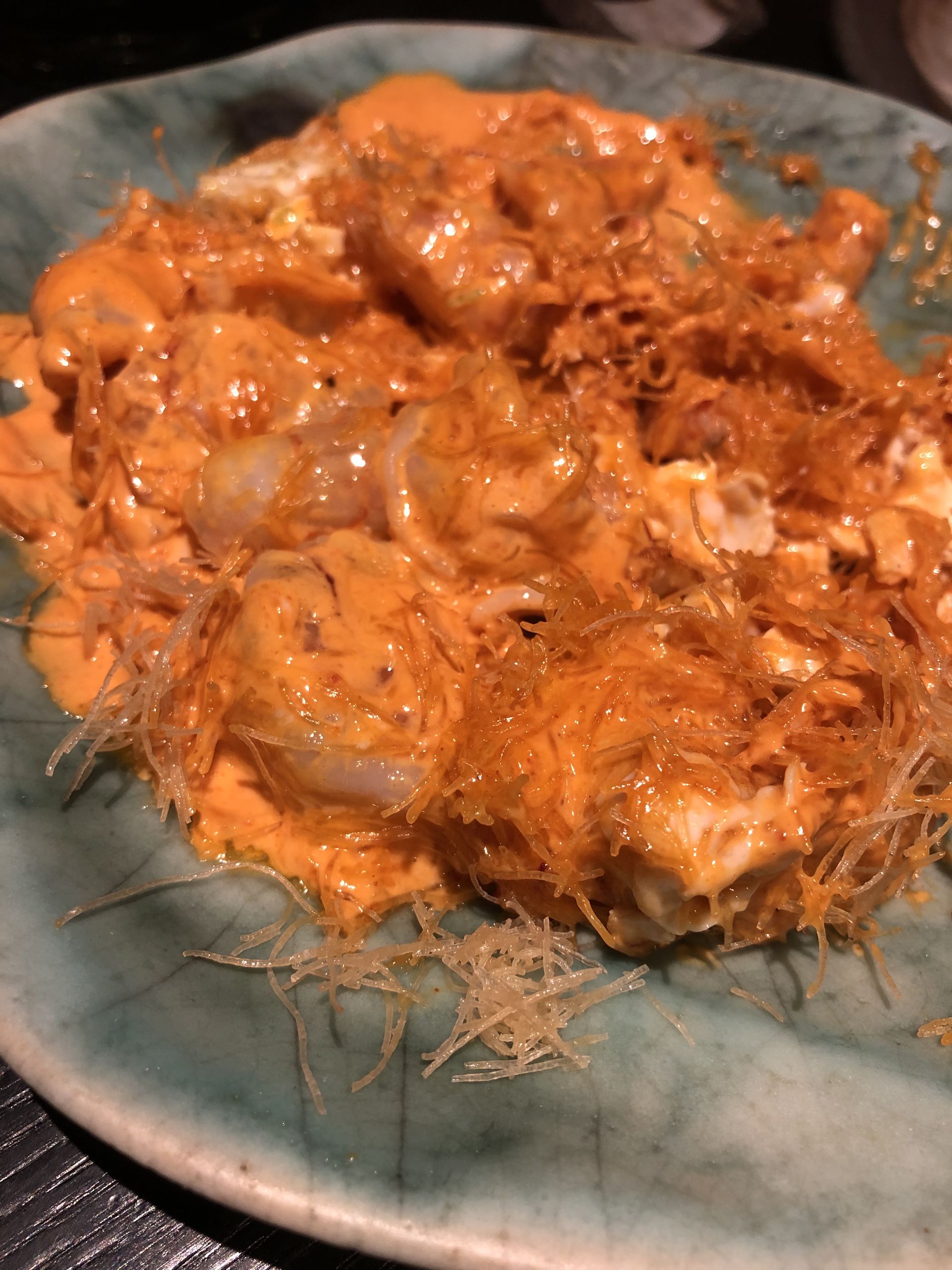 Ebi chilli (13,90€), langostinos picantes sobre base de fideos crujientes kataifi y huevo frito.