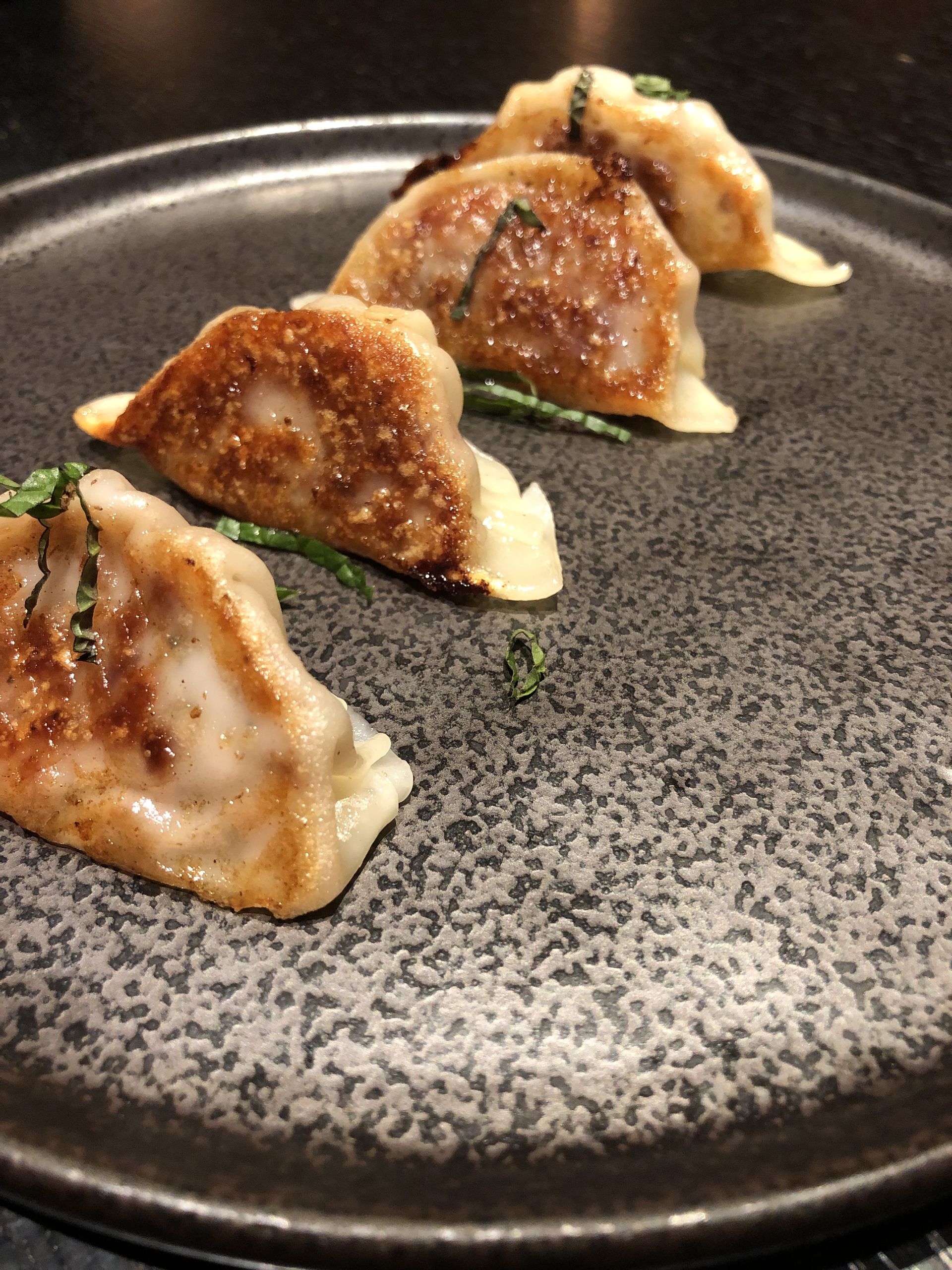 Buta gyoza (8,90€ / 4 unidades), unas empanadillas japonesas de butifarra de Perol y verduras a la plancha.