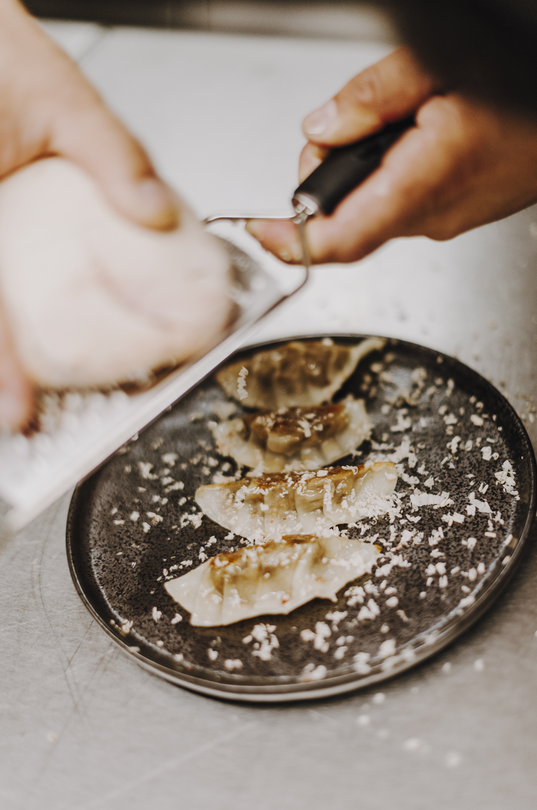 Kinoko gyoza, empanadillas japonesas de setas y butifarra, con ralladura de foie del Empordá.