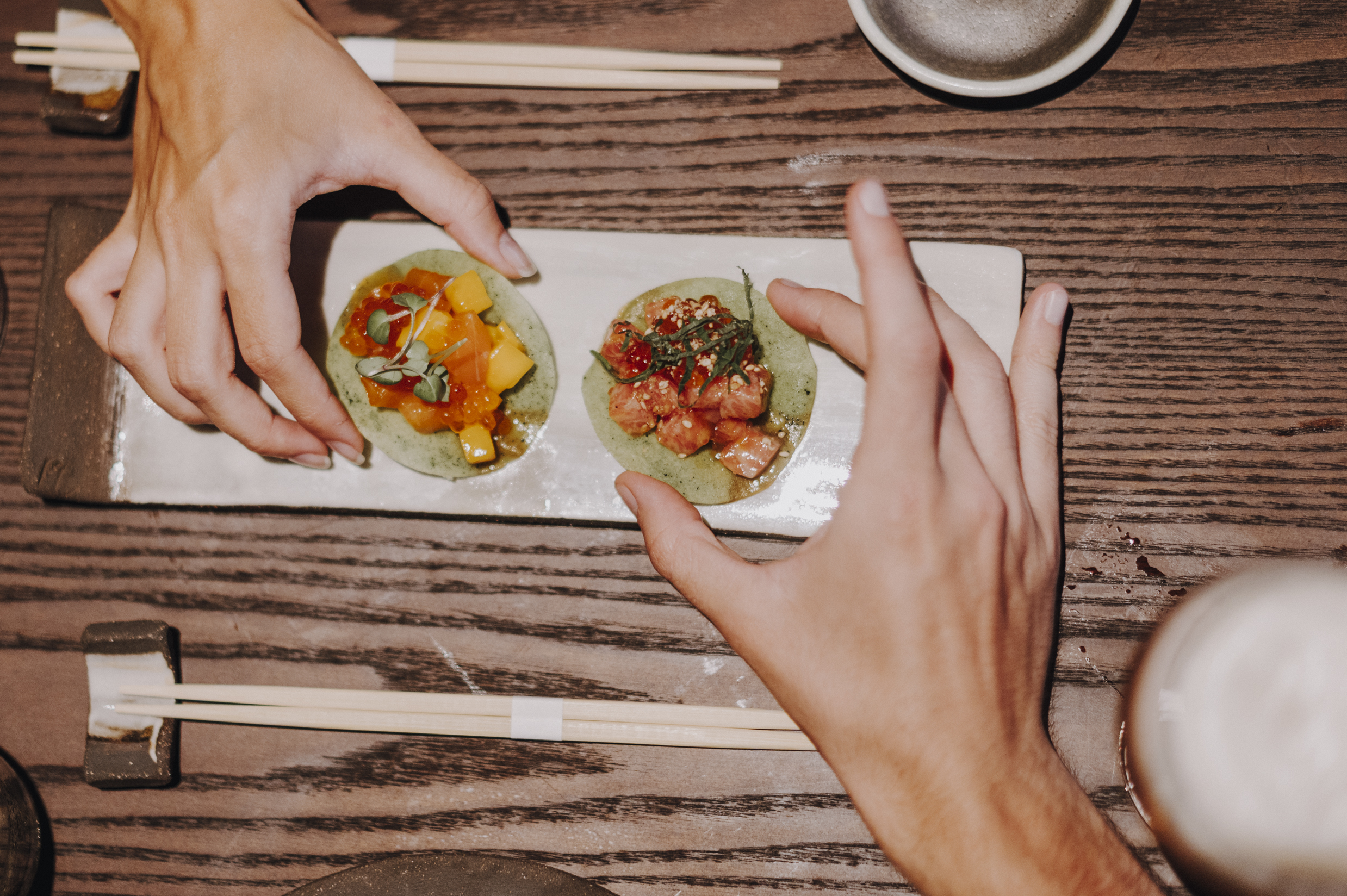 Maguro taco, mini taco de tartar de atún, hoja de wasabi marinada y shiso, sobre una oblea artesanal hecha con plancton marino y salmon taco, mini taco de tartar de salmón noruego con mango, huevas de trucha y yema de huevo, sobre una oblea artesanal hecha con plancton marino.