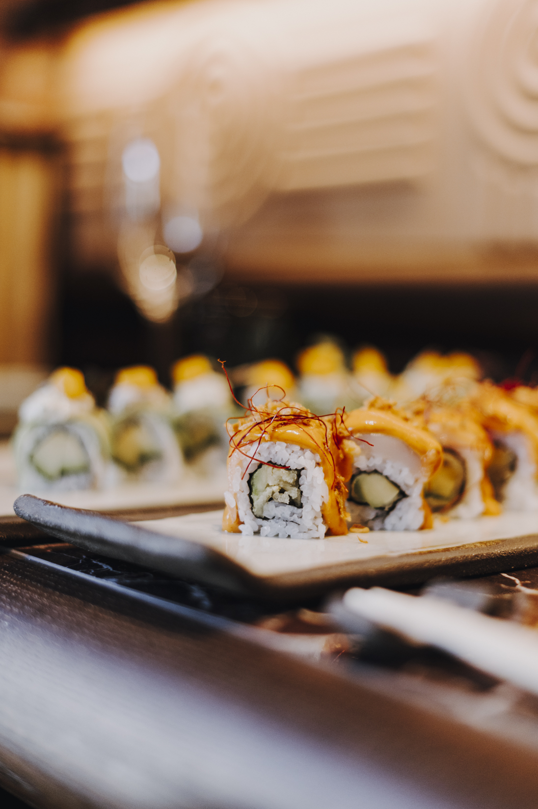 Desde el comedor puedes ver cómo el sushiman termina de emplatar las comandas.