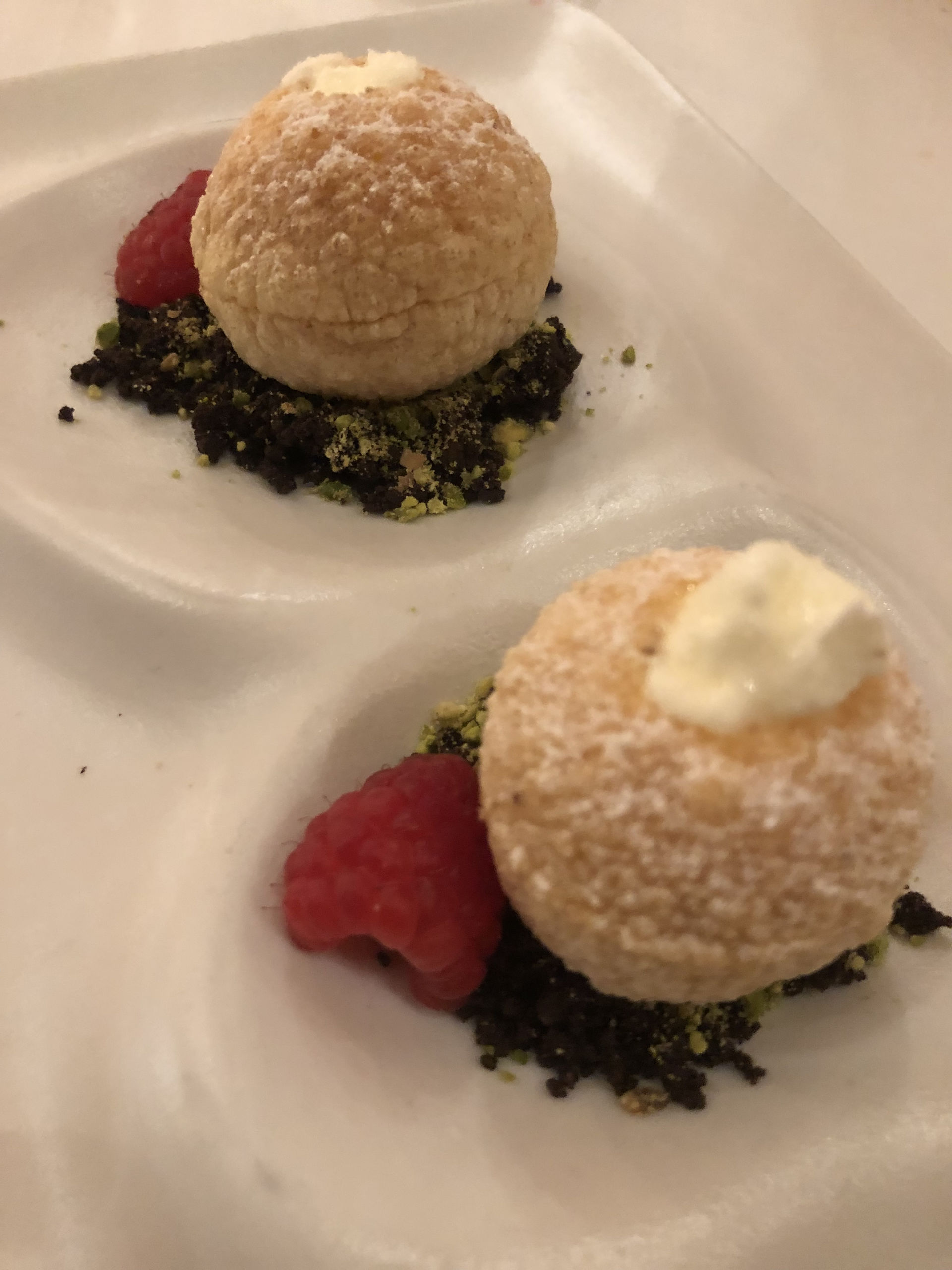 Aam panipuri, relleno de crema de mango, chantilly de lima, crumble de cacao y chile, para comerlo de un bocado.
