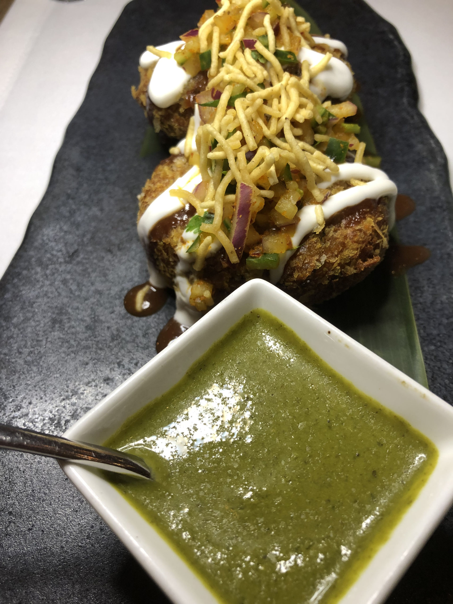 Aloo tikki, unos muy ricos pasteles de patata rellenos de guisantes, acompañados de chutney de menta, tamarindo y raita.