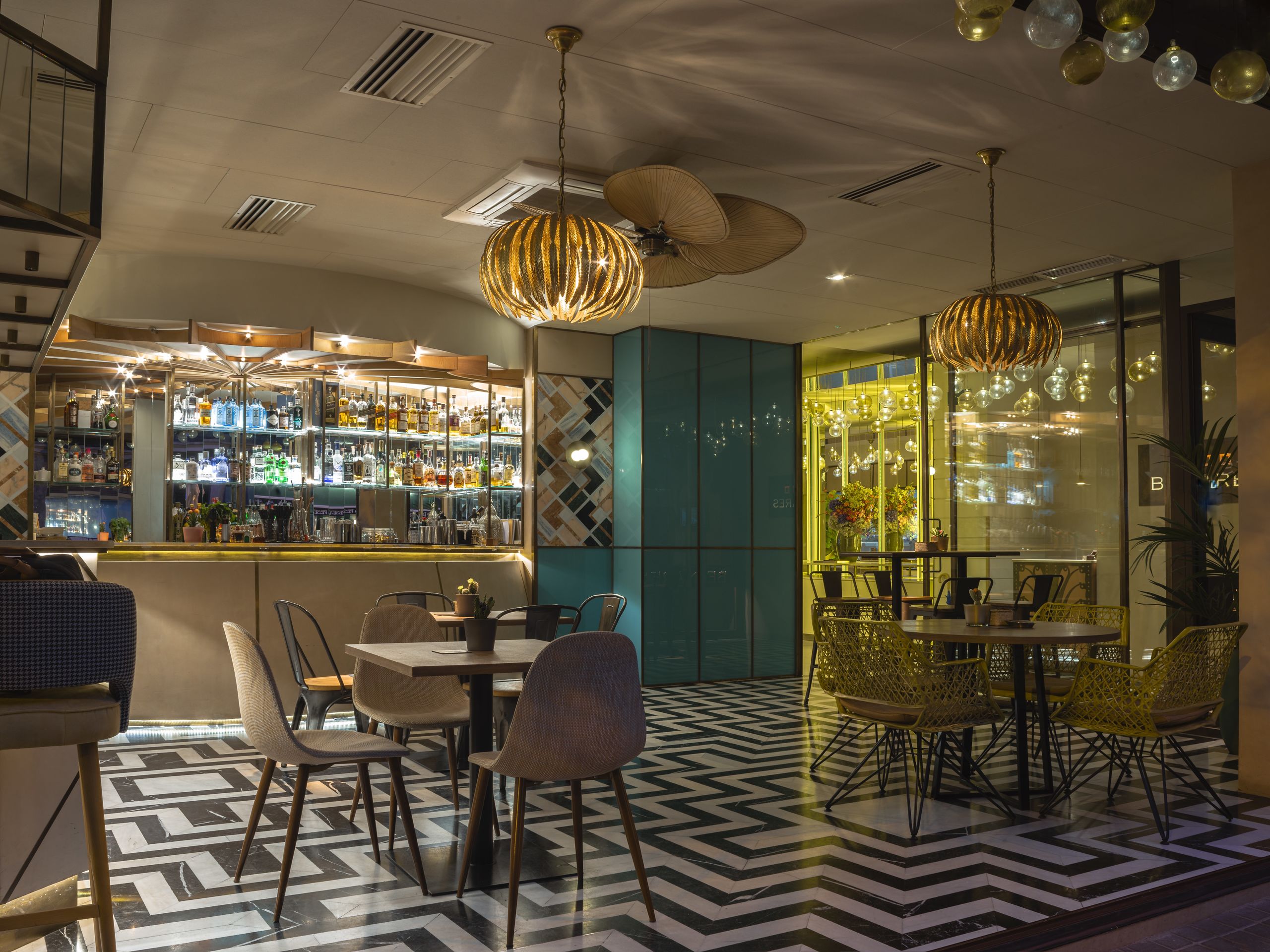 El bar acristalado de la entrada de Benares se puede abrir para que parezca que estás en la terraza.