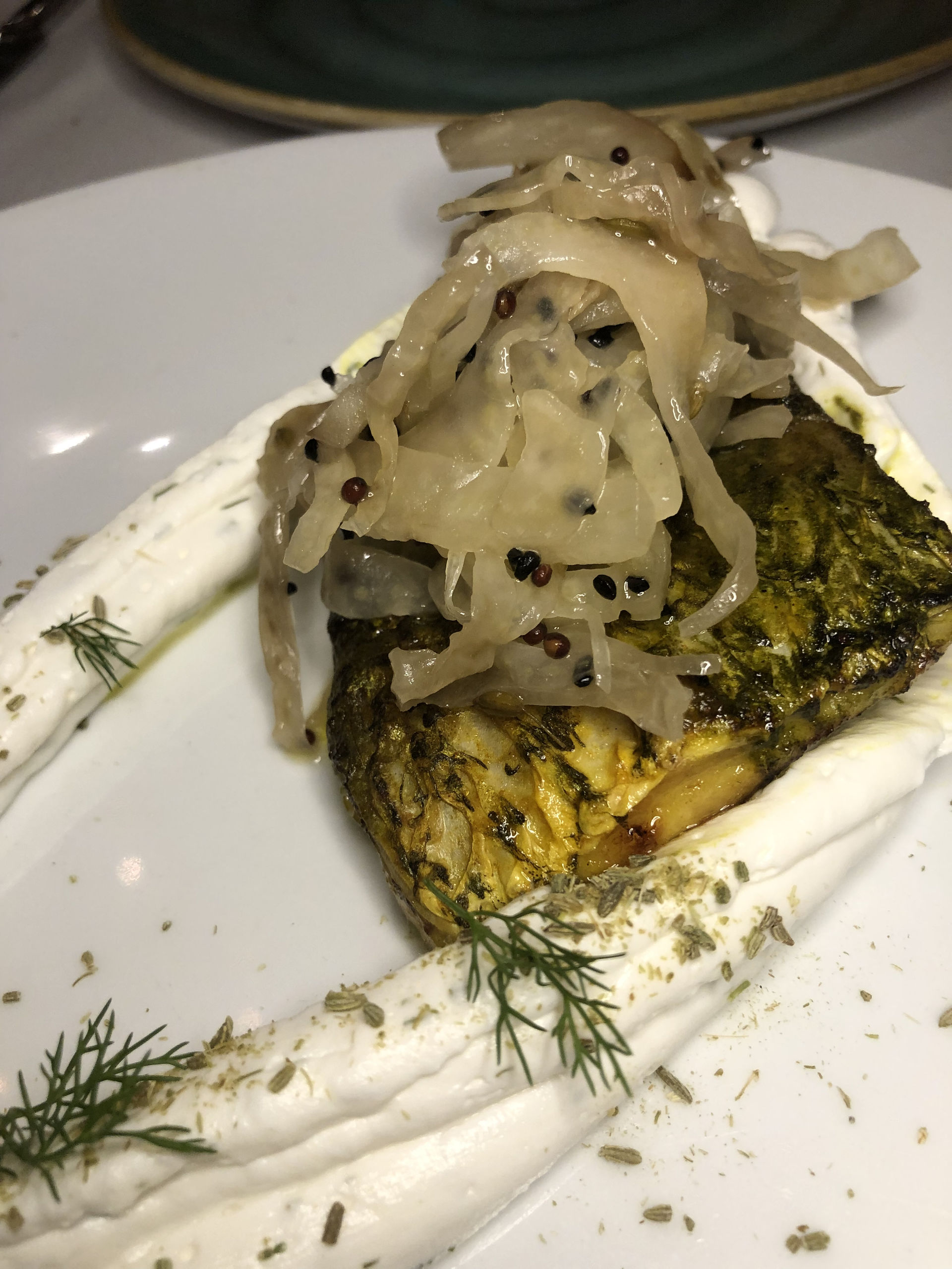 Dhaniya macchi tikka, una corvina de Conil marinada en cilantro y jengibre con ensalada de hinojo encurtida al Panch Phoron.