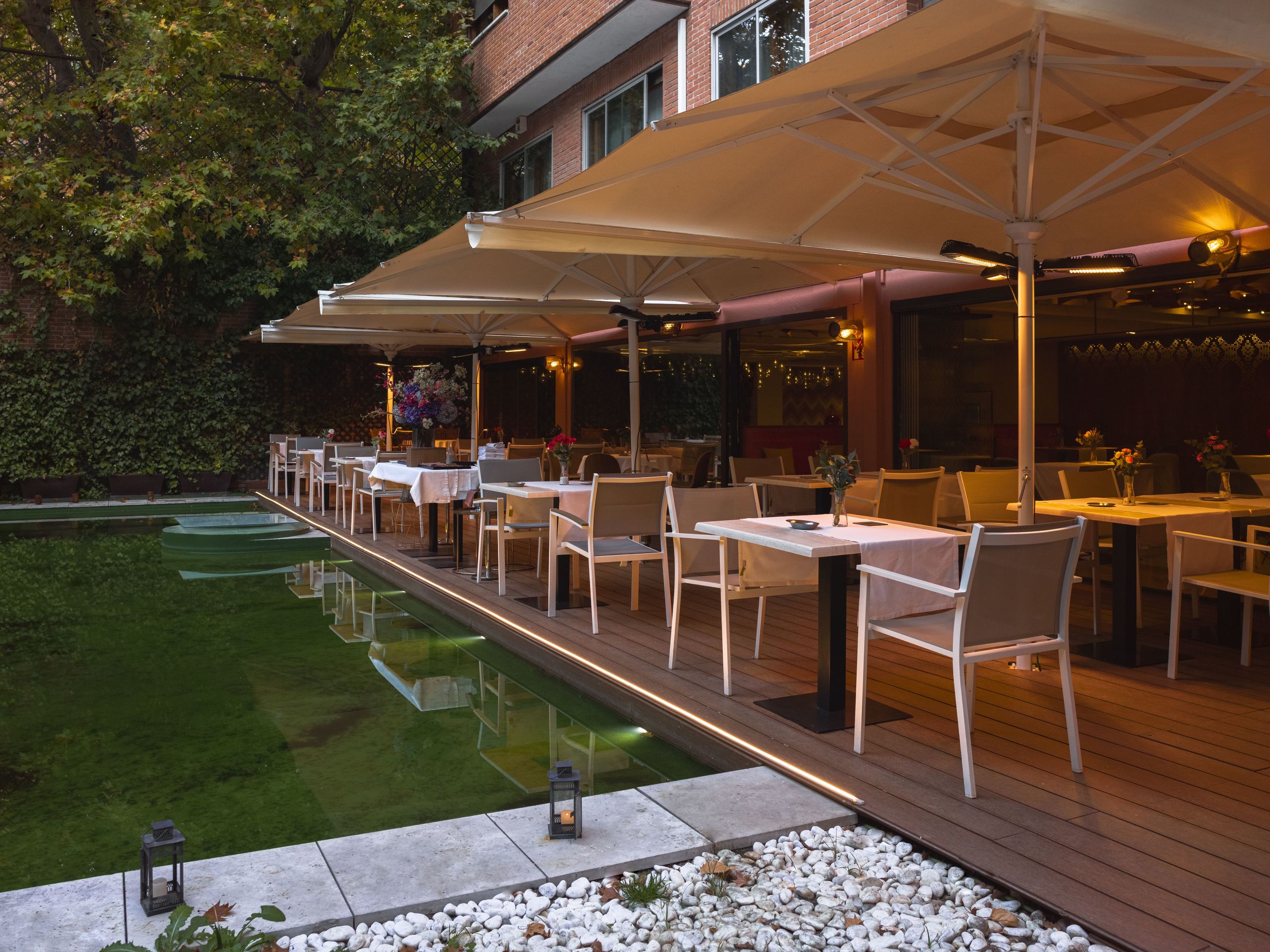 El patio interior con estanque es un oasis envolvente gracias a su cuidada iluminación.
