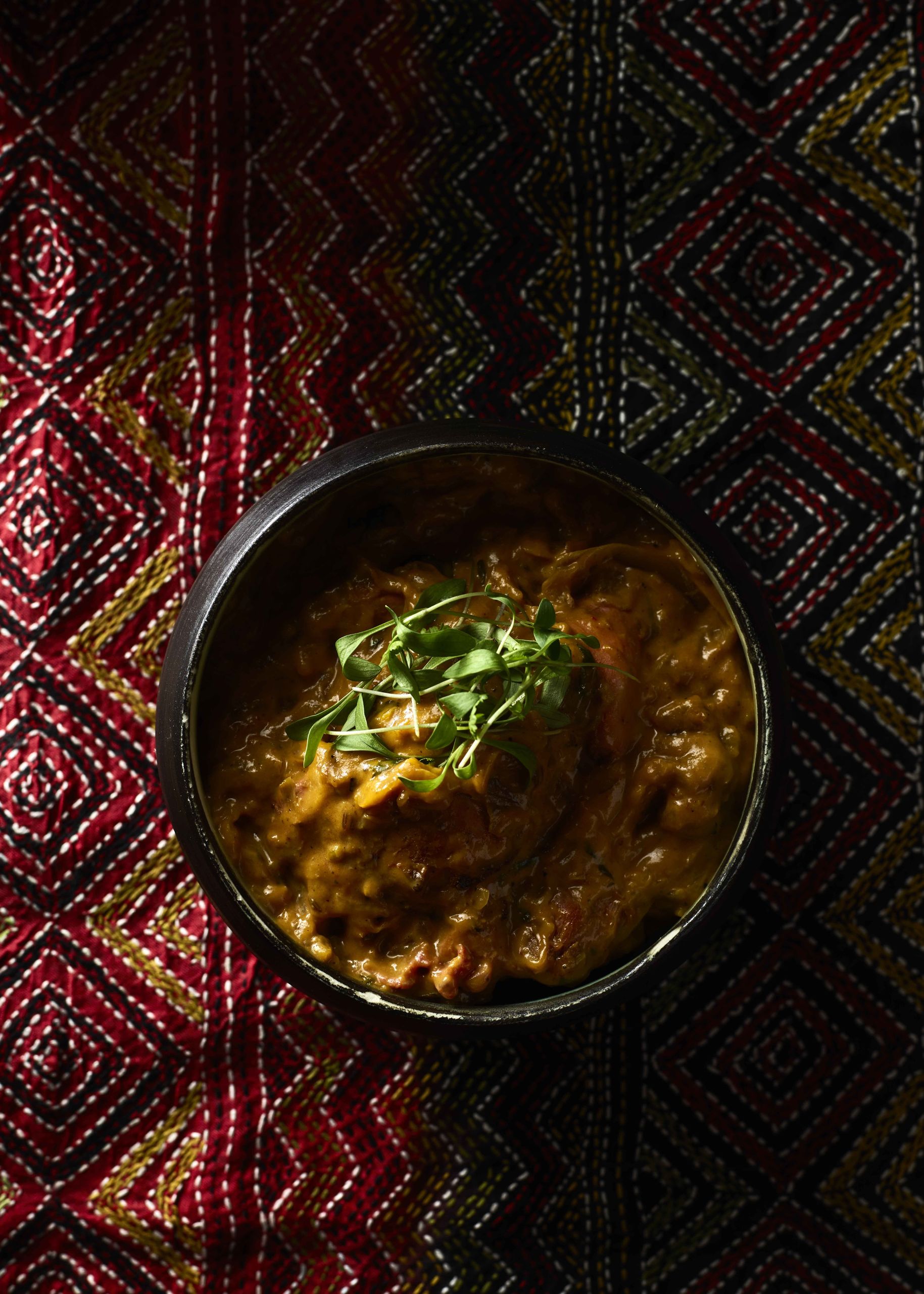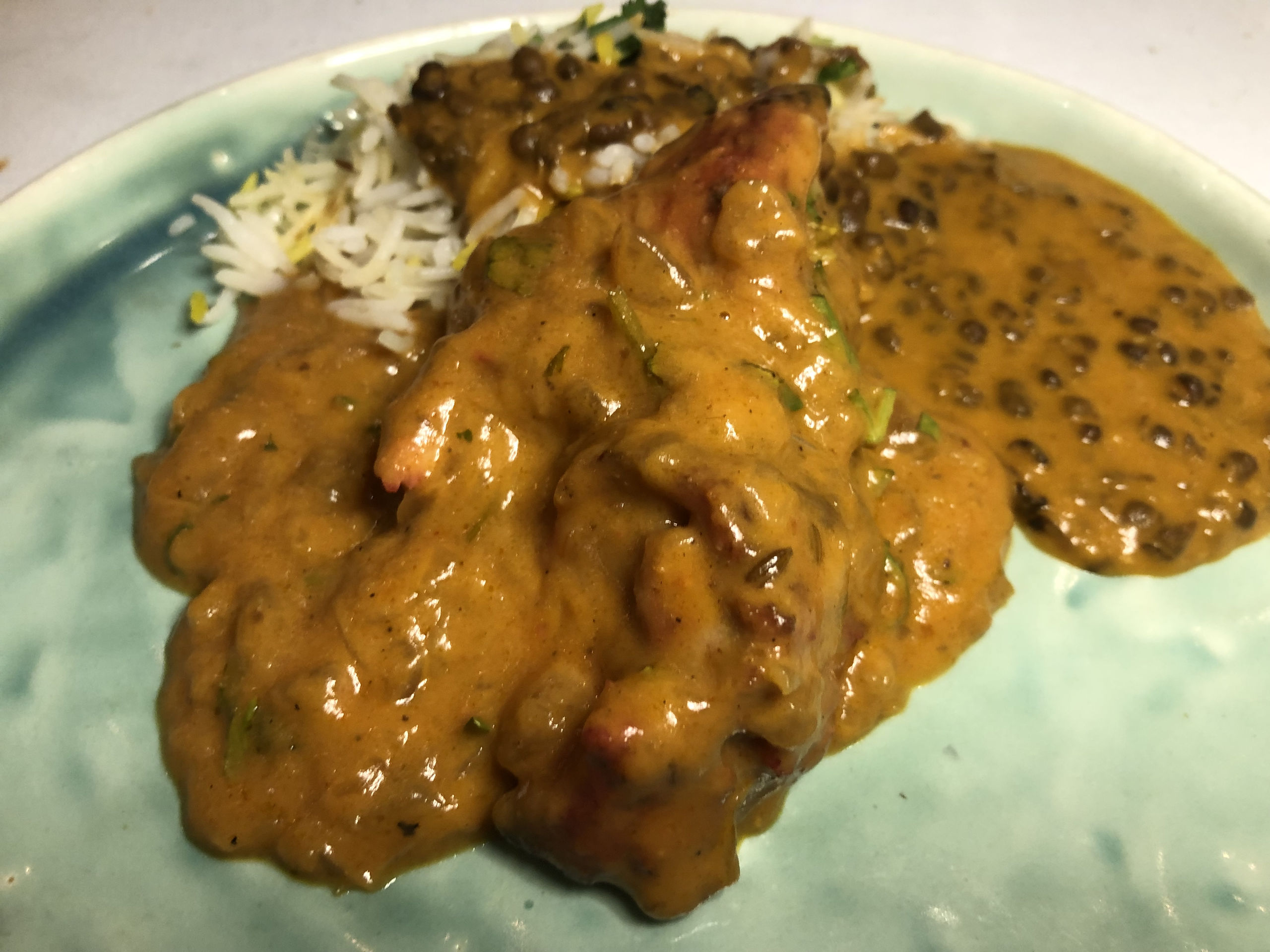 Mezcla del butter chicken, el clásico curry de pollo en cremosa salsa de tomate al macís, acompañado de dal makhani, unas lentejas negras al estilo tradicional y de pulao, arroz con aroma de comino y azafrán.