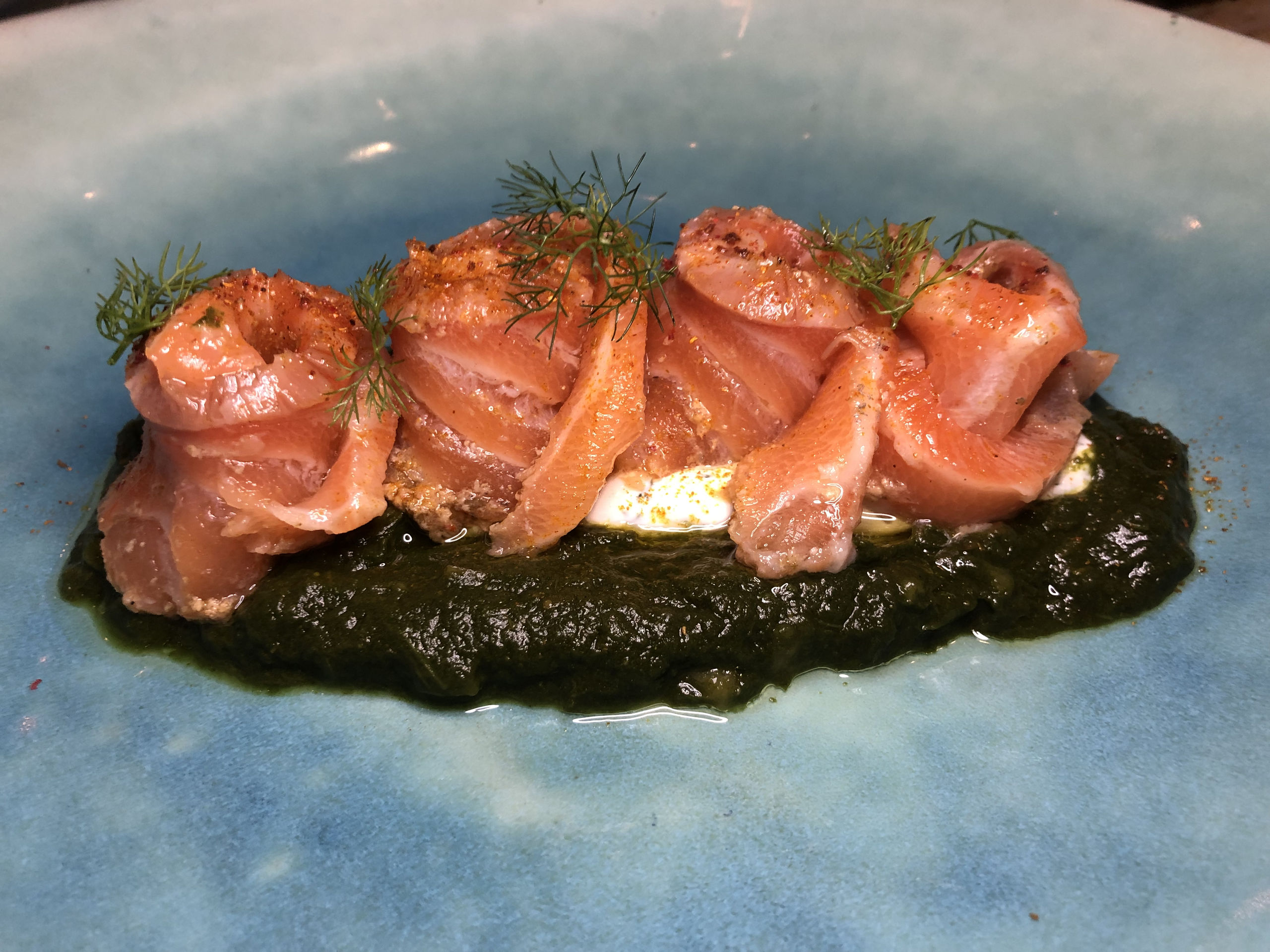 Un fuera de carta de verano de salmón ligeramente cocido en el tandoor, sobre cama de curry de espinacas, raita de eneldo, pepino y tarka de pimienta rosa.