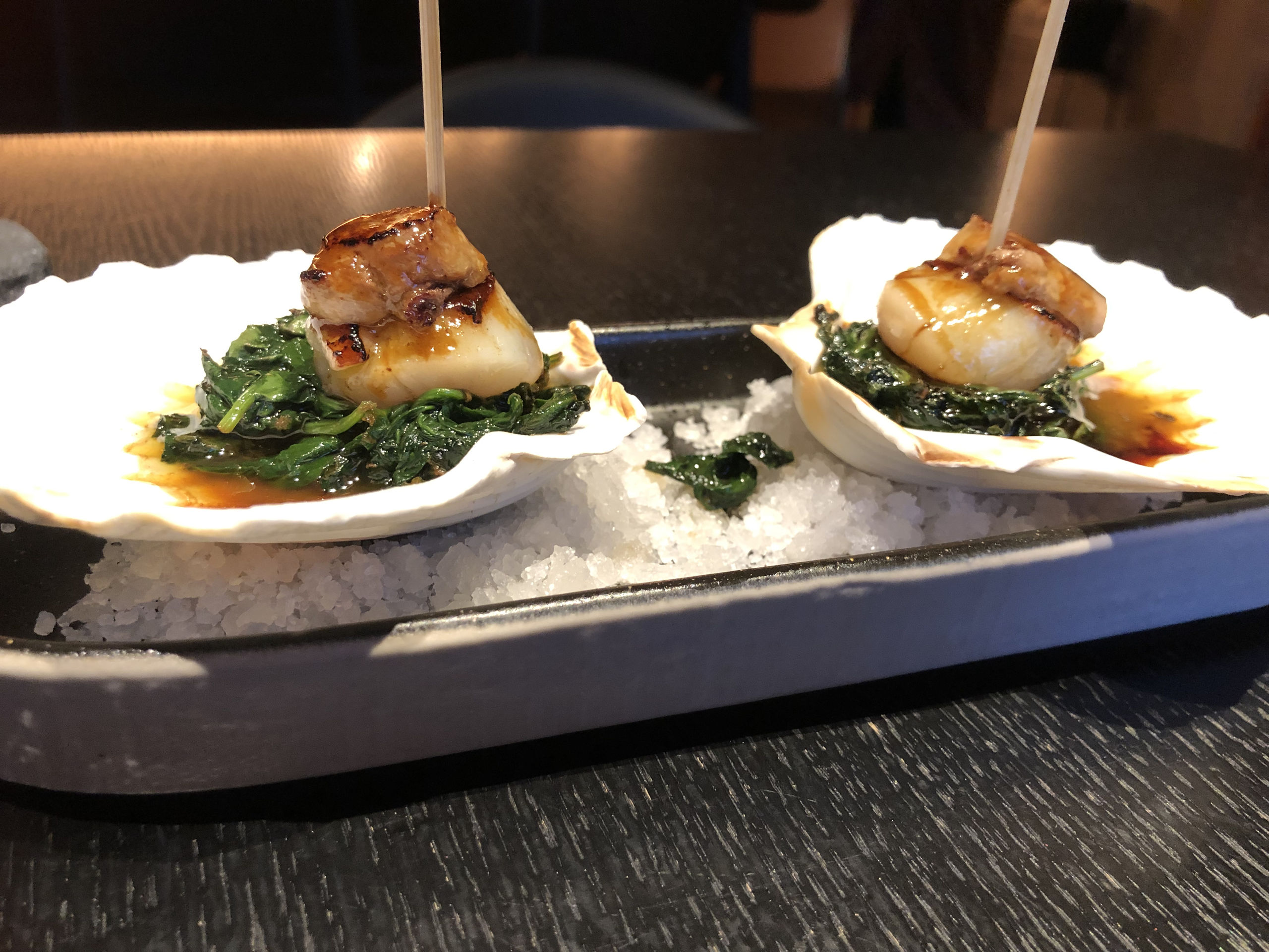 Tras probar los edamames (4,80€) de aperitivo con una cerveza japonesa Kirin Ichiban, comprobamos ese buen trato del producto con las tapas japonesas y unas espectaculares yaki hotate to foie (4,90€), lo que traducido es un pincho de vieira a la plancha co foie del Ampurdán, espinacas y salsa teriyaki. Están tan ricas que son para comerse todas las que te puedas e irte a casa más que satisfecho. Empieza el chef poniendo el listón muy pero que muy alto.