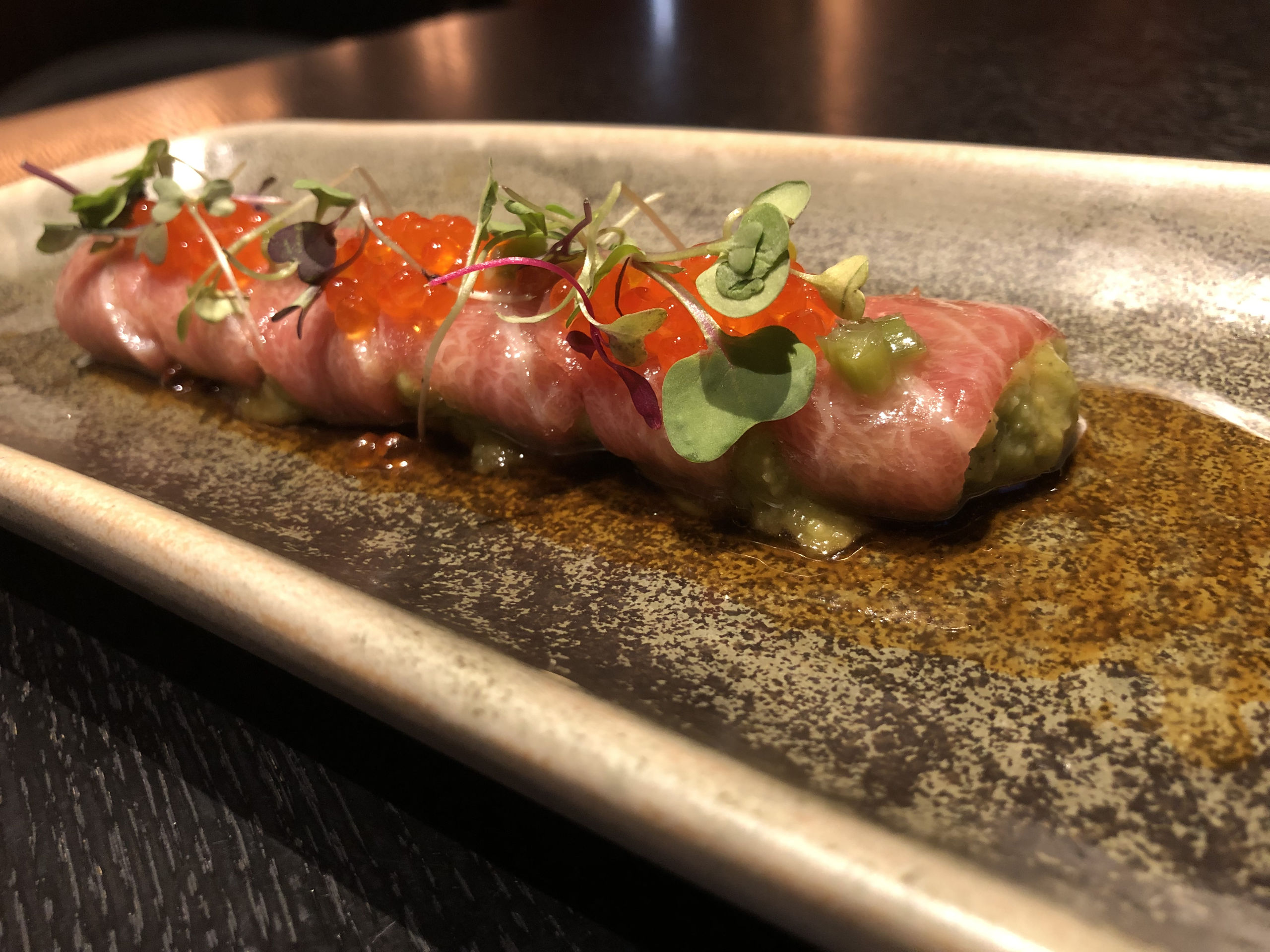 Y de ese ensamblaje entre la decoración y la cocina para que la experiencia gastronómica sea completa, nos pasamos a los entrantes y al raw bar. De aquí probamos un toro no caneloni (19,90€), un canelón de ventresca de atún con aguacate, huevas de trucha y hoja de wasabi fresco. Un plato que a pesar de gozar de un producto de primera le falta algo de sabor para redondearlo. Al igual que la buta gyoza (8,90€ / 4 unidades), unas empanadillas japonesas de butifarra de Perol y verduras a la plancha.