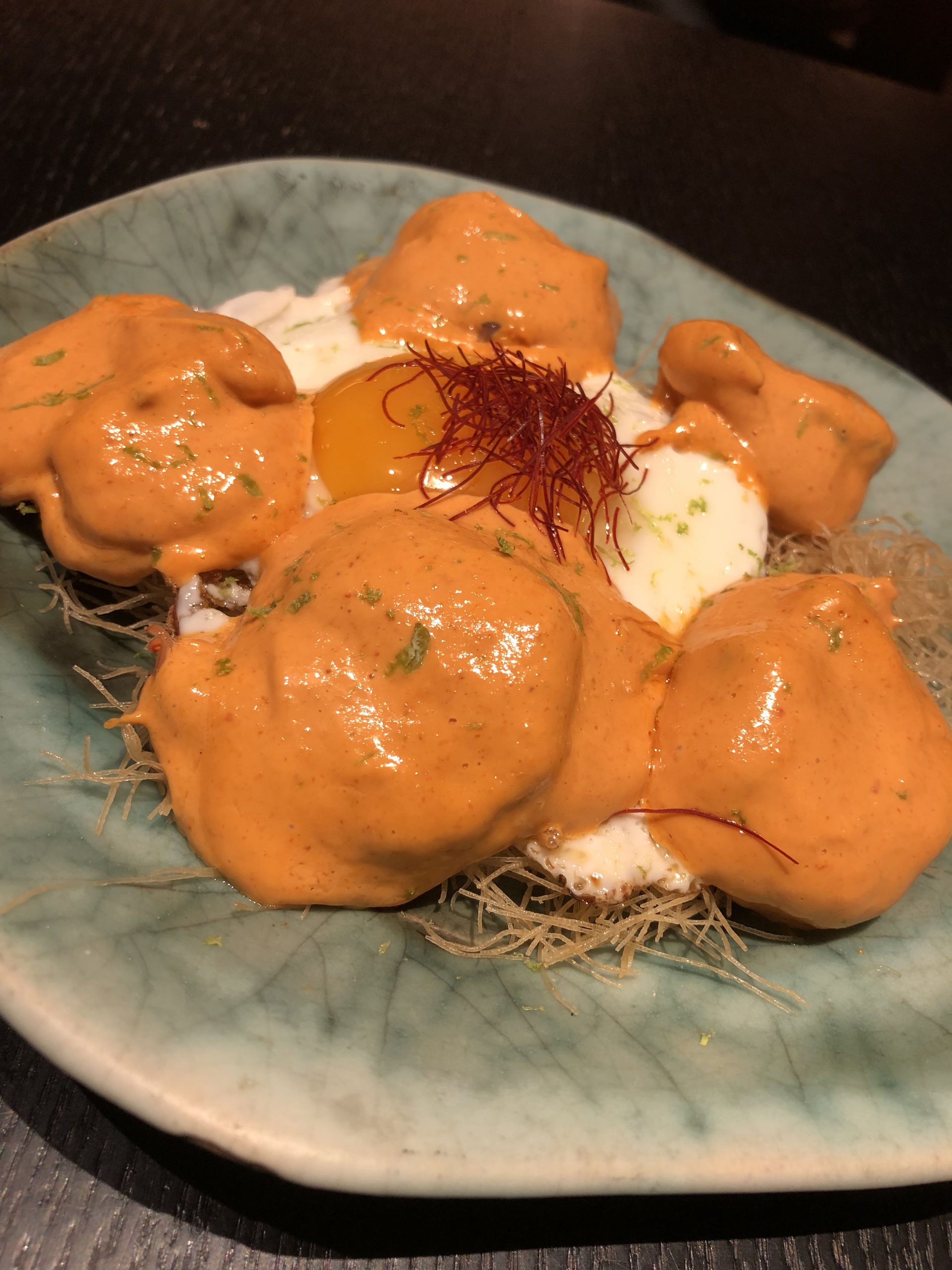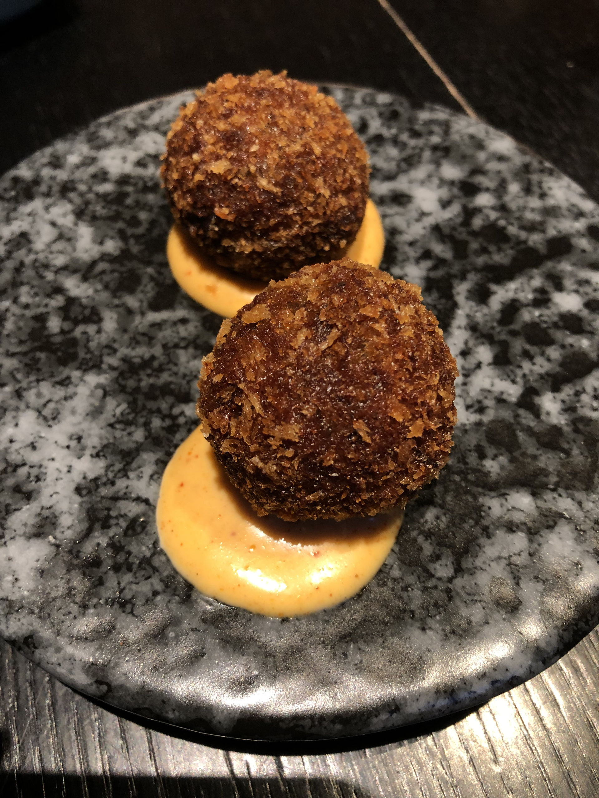 De la fusión japonesa y mediterránea llega a la mesa la sukiyaki croquette (2,20€), una muy buena croqueta japonesa de rabo de toro rebozada en panko y presentada sobre mayonesa kimchi.