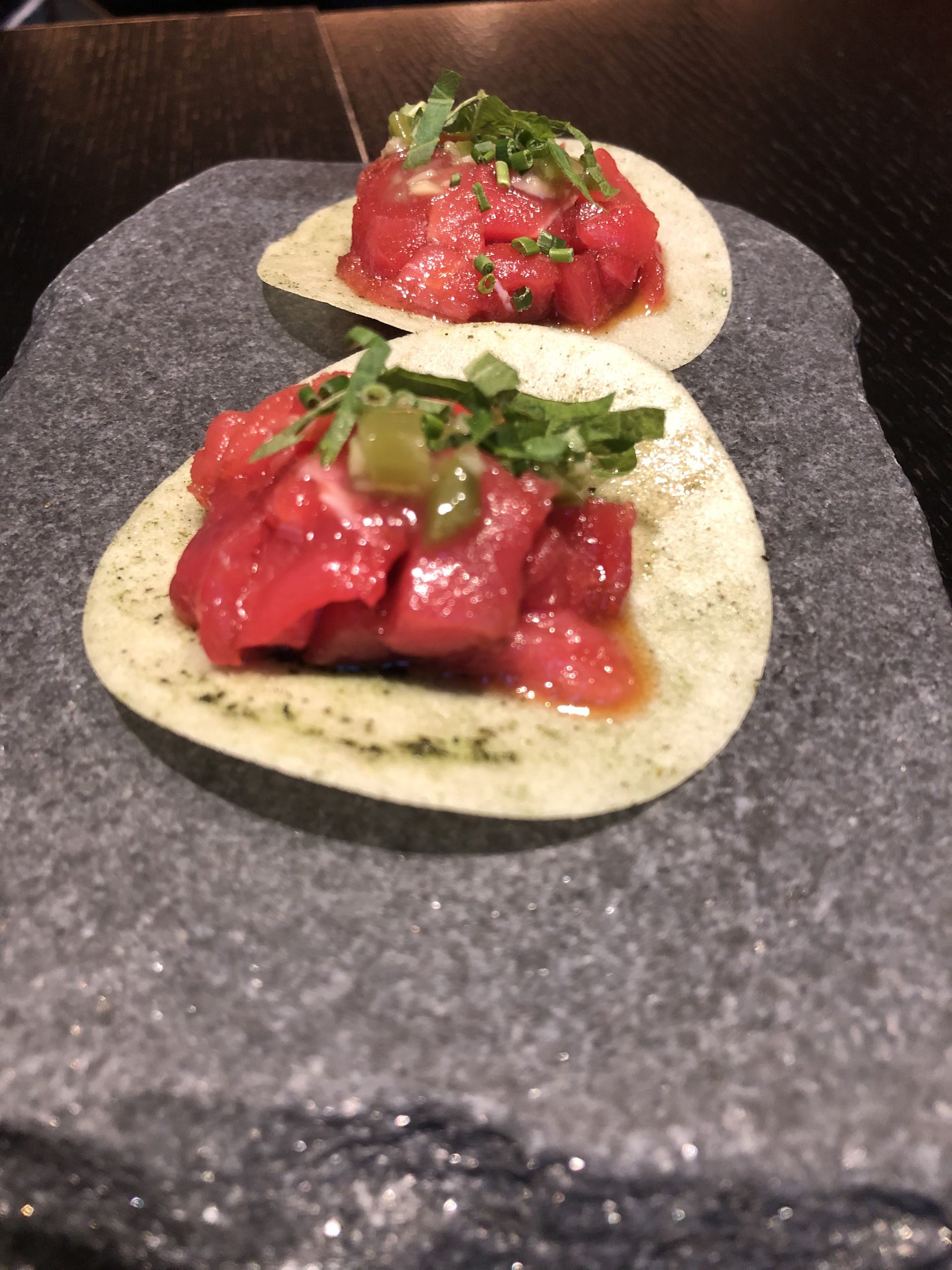 Seguimos probando la buena carta de Nomo con un maguro taco (4,50€), un mini taco de tartar de atún con hoja de wasabi marinada y shiso, sobre una oblea artesanal hecha con plancton marino. Muy buen bocado para seguir por este viaje al Lejano Oriente.