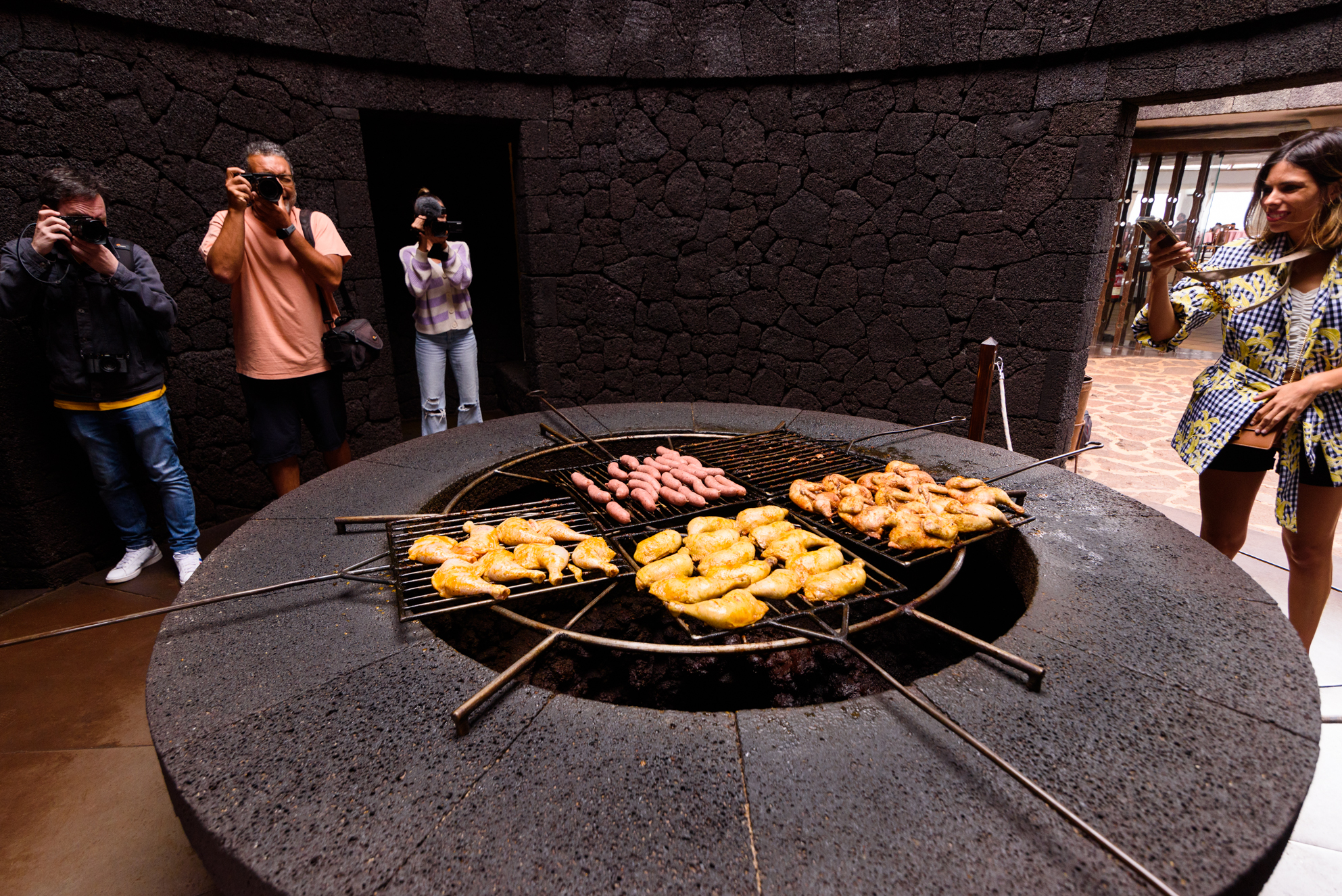 Restaurante El Diablo, sobre el Timanfaya en Lanzarote. Es muy recomendable pedir en el restaurante el pollo que se cocina sobre un tubo volcánico que siempre está expulsando aire caliente venido de la lava subterránea, sobre el que se coloca una enorme parrilla para deleite de comensales y curiosos.