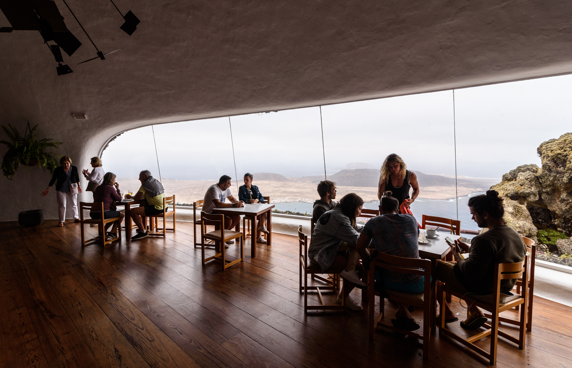 Tomarse un almuerzo o un café en el interior de la cafetería del Mirador de Río y disfrutar de las vistas a través de sus grandes ventanales es la recompensa después de soportar la intensidad del viento del mirador situado en lo alto.