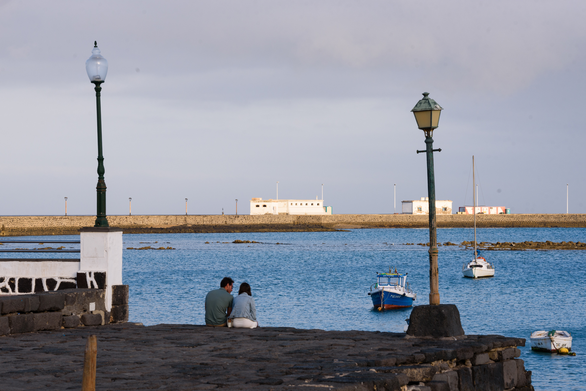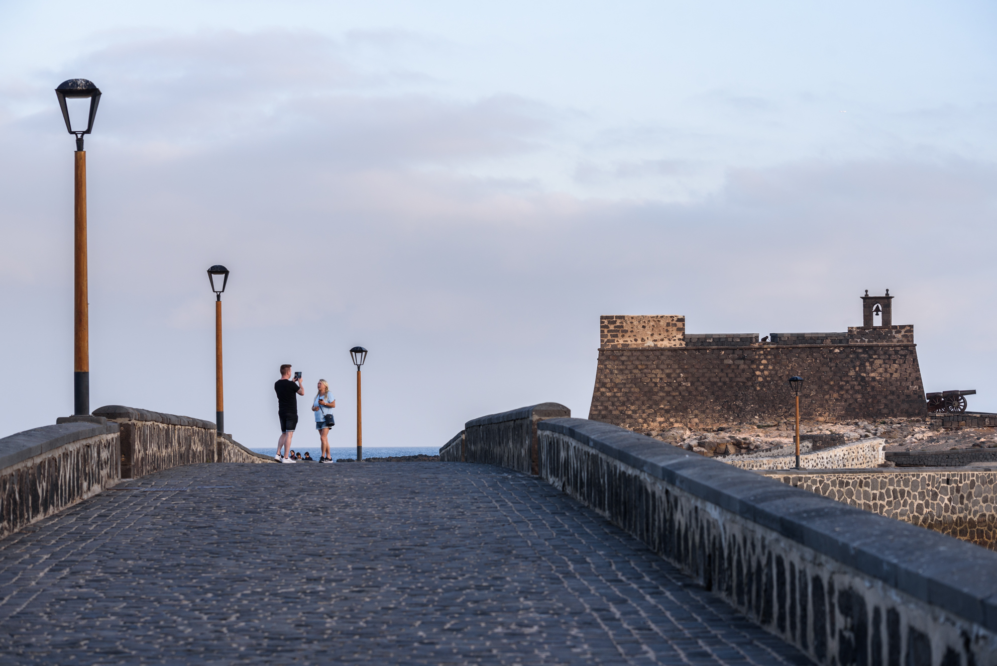 Dos turistas se fotografían frente al Castillo de San Gabriel, la fortaleza de Arrecife que alberga el Museo de Historia de Arrecife, propiedad del Ayuntamiento.