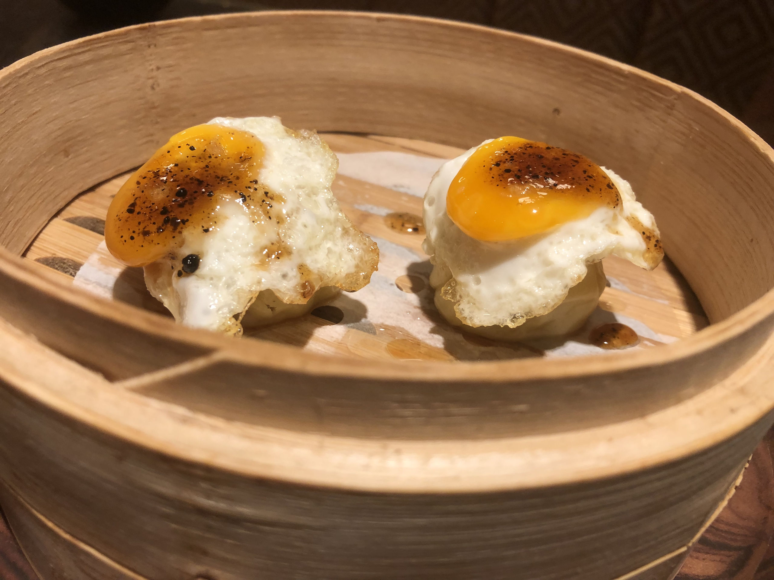 Siu mai de tortilla española coronada con huevo de codorniz trufada.