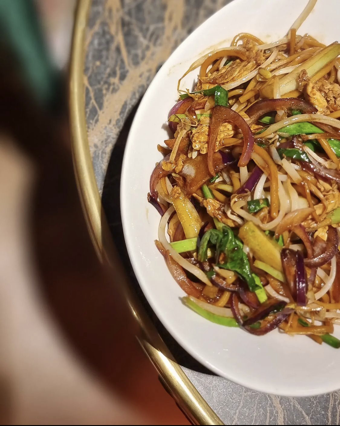 Tallarines hechos a mano con langostinos y cerdo adobado, al estilo cantonés.
