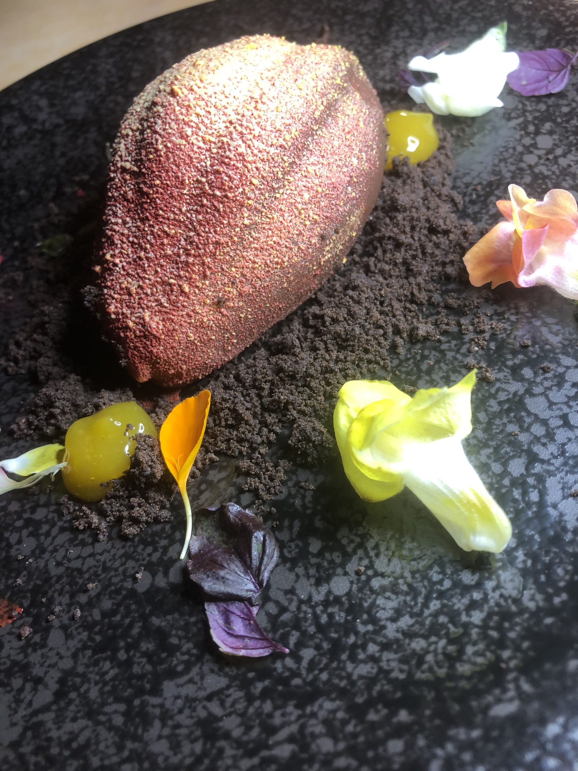 Cacao salvaje, con chocolate venezolano, mousse de chocolate con leche, gel de maracuyá y bizcocho de chocolate.