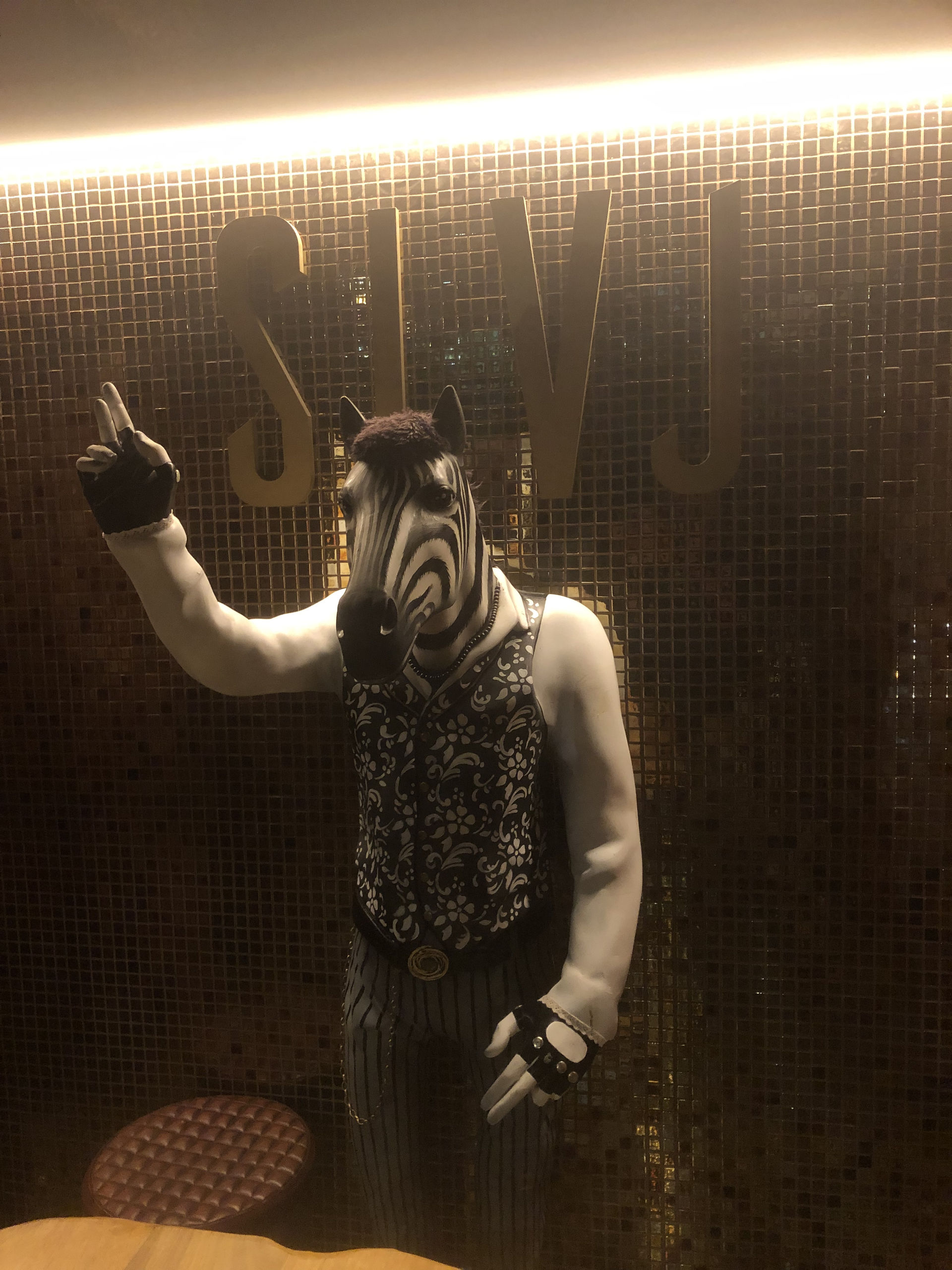 La decoración de Salvaje está llena de animales y plantas, como esta cebra humana que preside la zona de los baños.