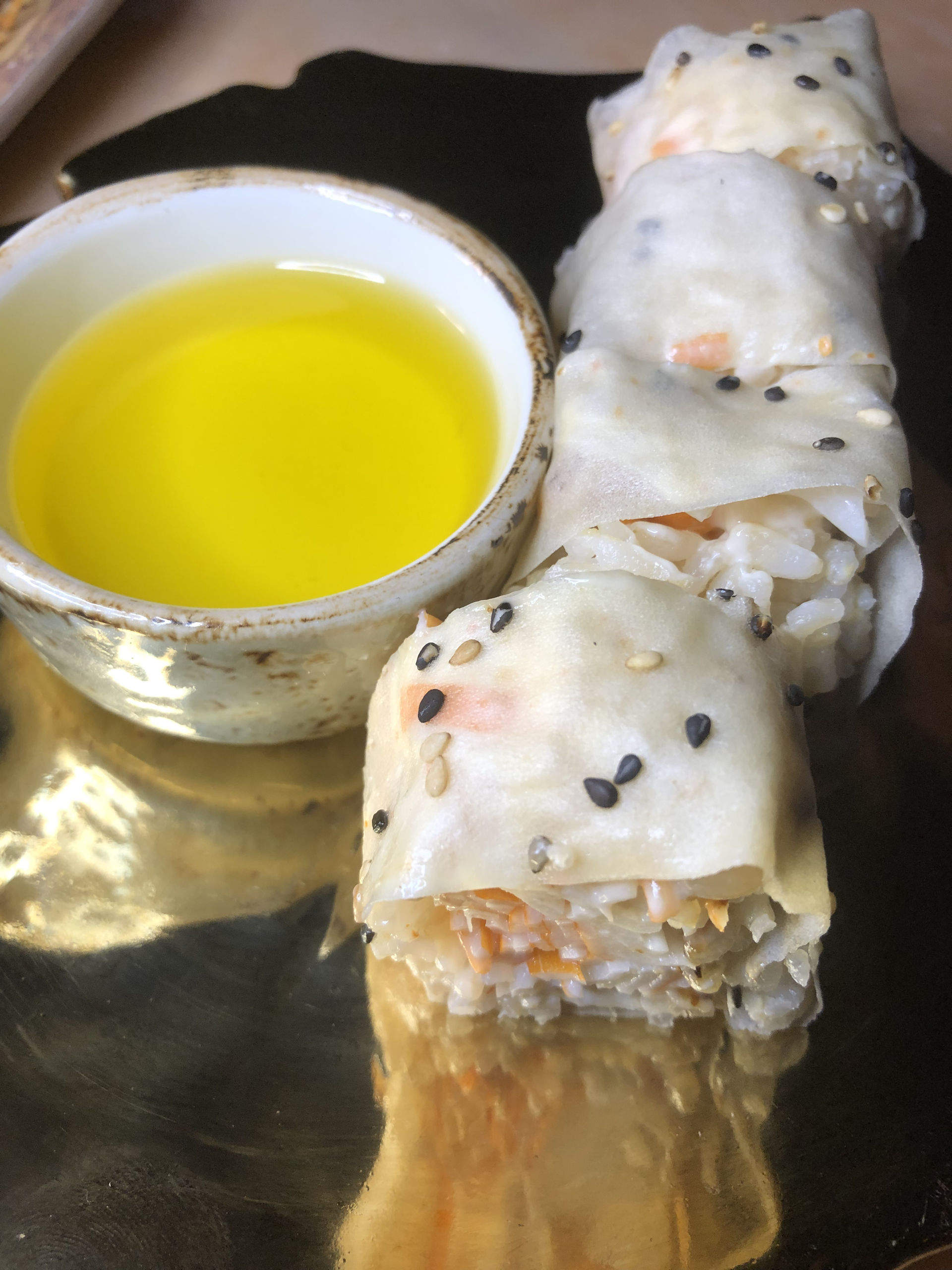 Muy rico dinamita roll, con cangrejo osaki glaseado en aderezo ‘dinamita’ envuelto en hoja de soja y acompañado de mantequilla trufada.