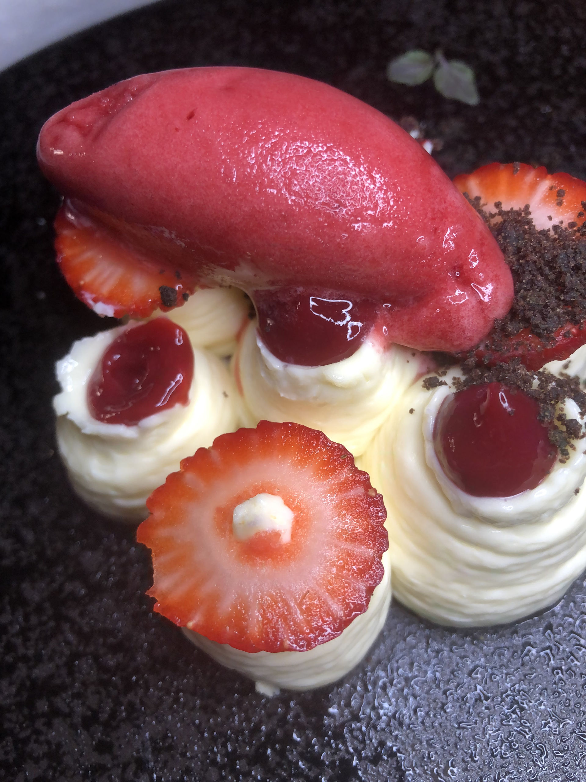 Ichigo & cream, crema de chocolate blanco, crujiente de chocolate y café, acompañado de helado de semillas de cilantro y frambuesas.