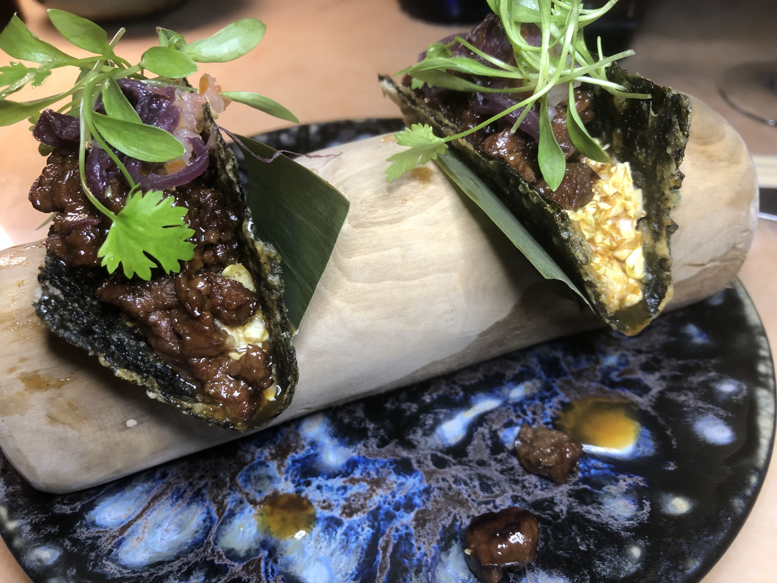 Originales y buenos salvaje japanese tacos, con vacío de vaca salteado al wok, pasta de yuzu y napa, sobre alga nori crocante.