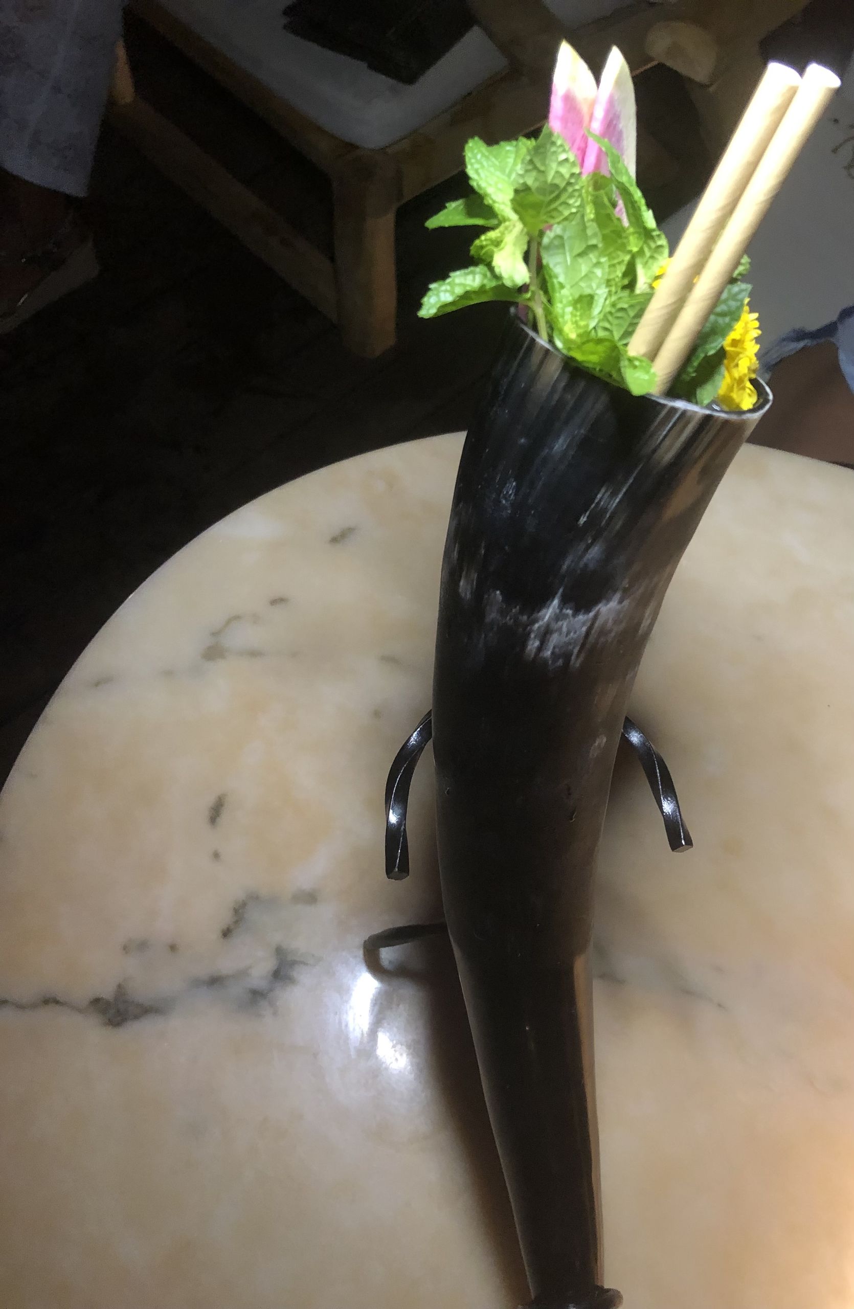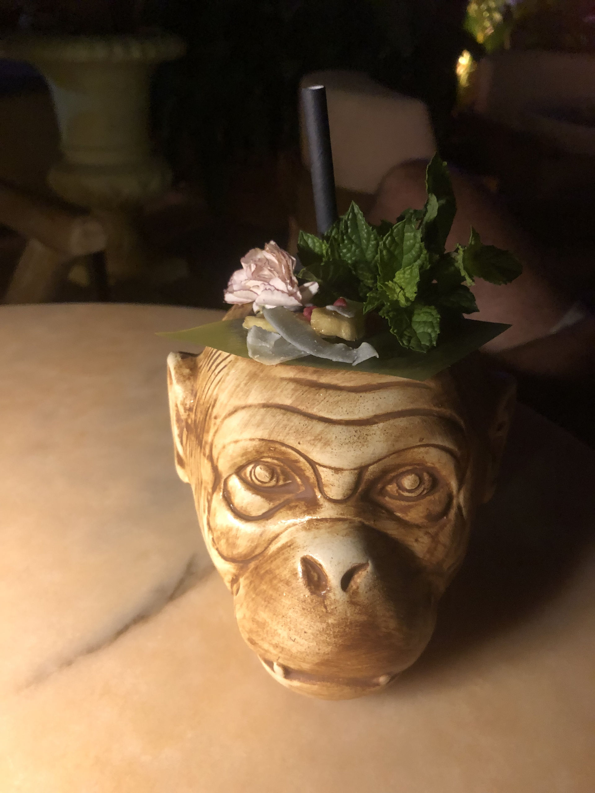 Monkey Colada, con ron, ron de coco, agua de Coco, pandam, piña al curry y cítricos.