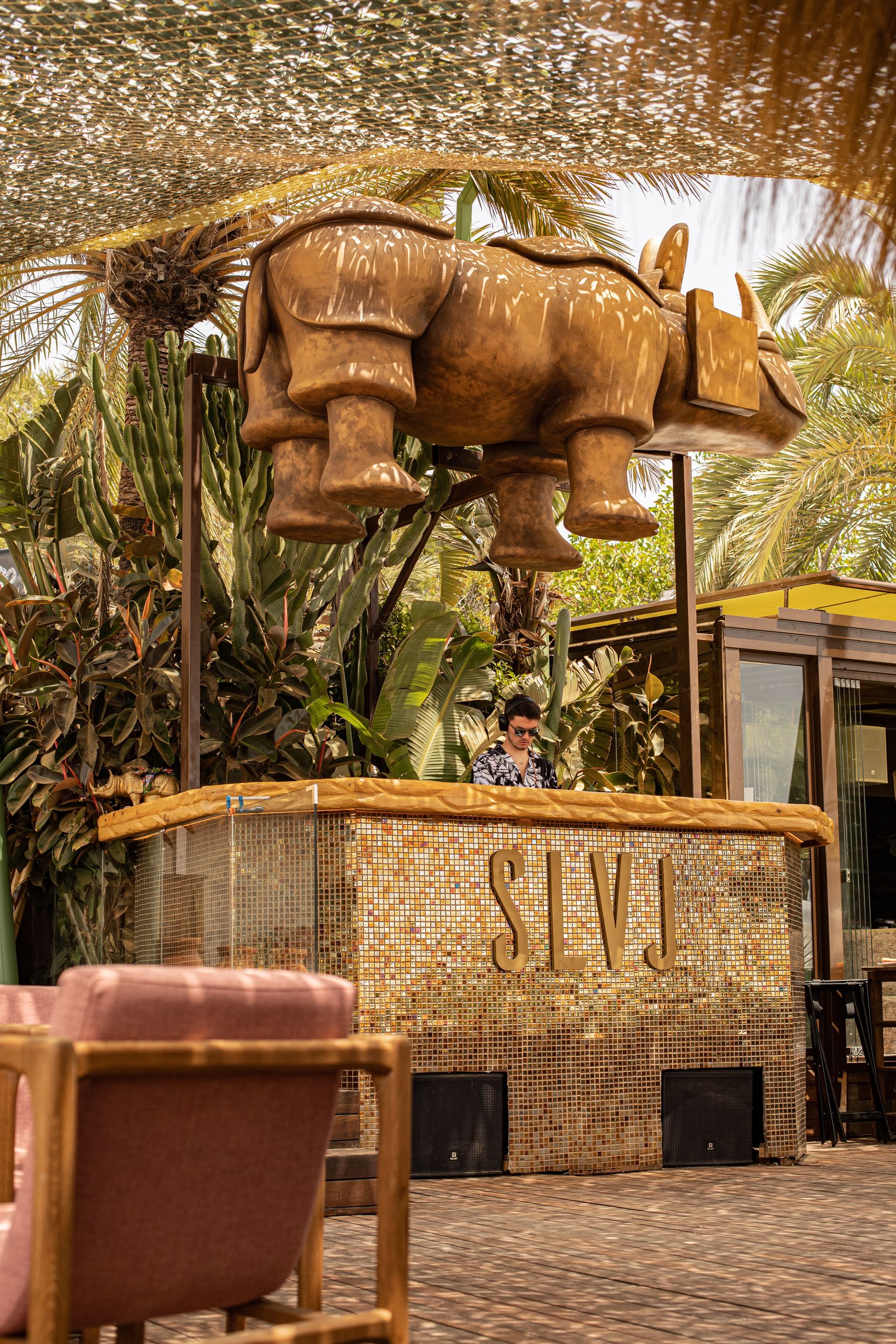 El icónico hipopótamo de todos los restaurantes Salvaje también está en el de Marbella custodiando la mesa del DJ.