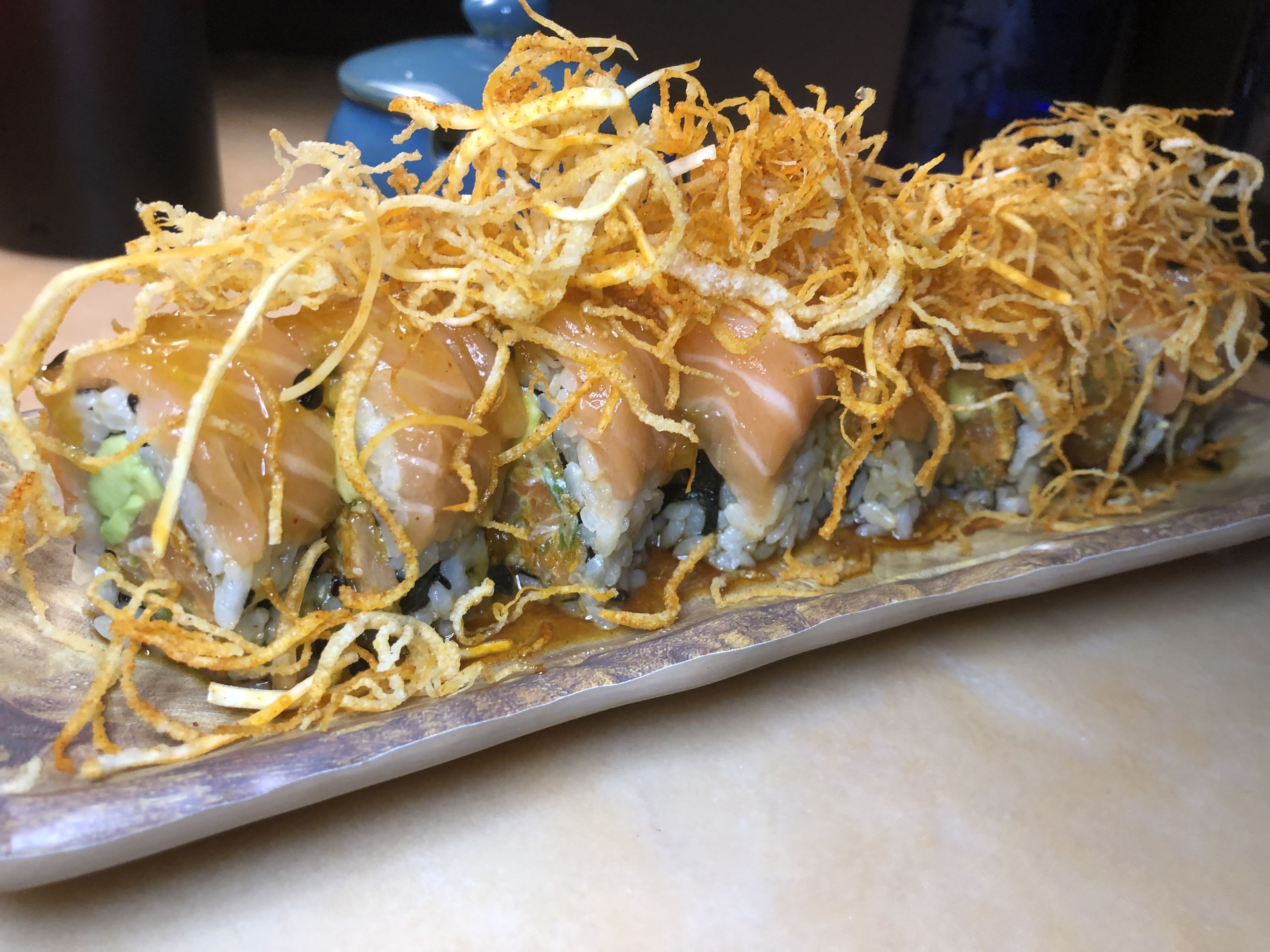 Muy rico el spicy Salmon, relleno de salmón, cebollino, spicy mayo y aguacate, con topping de salmón, wonton crispy y aderezo de maracuyá y anguila.