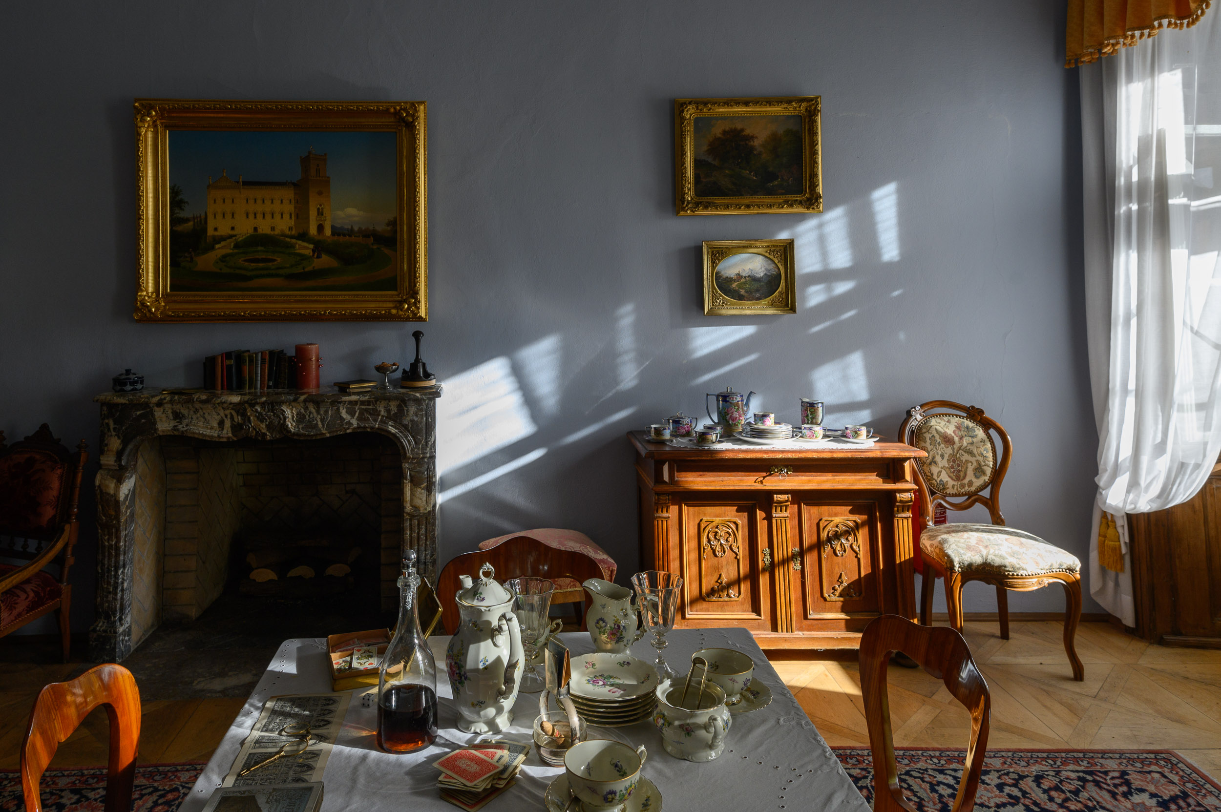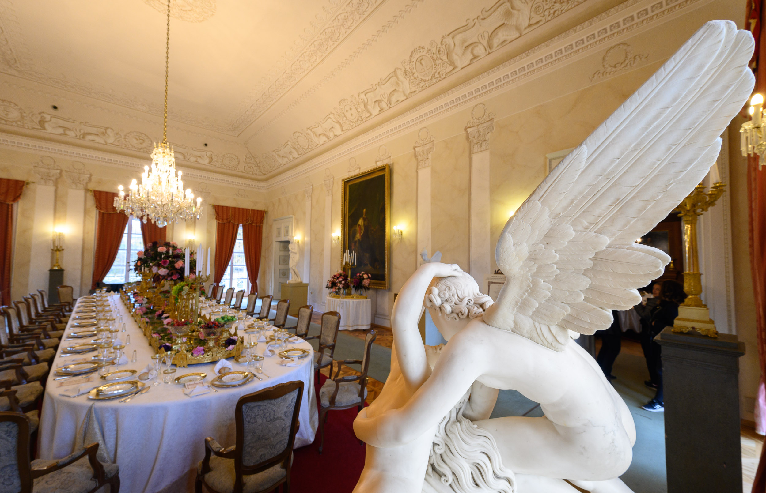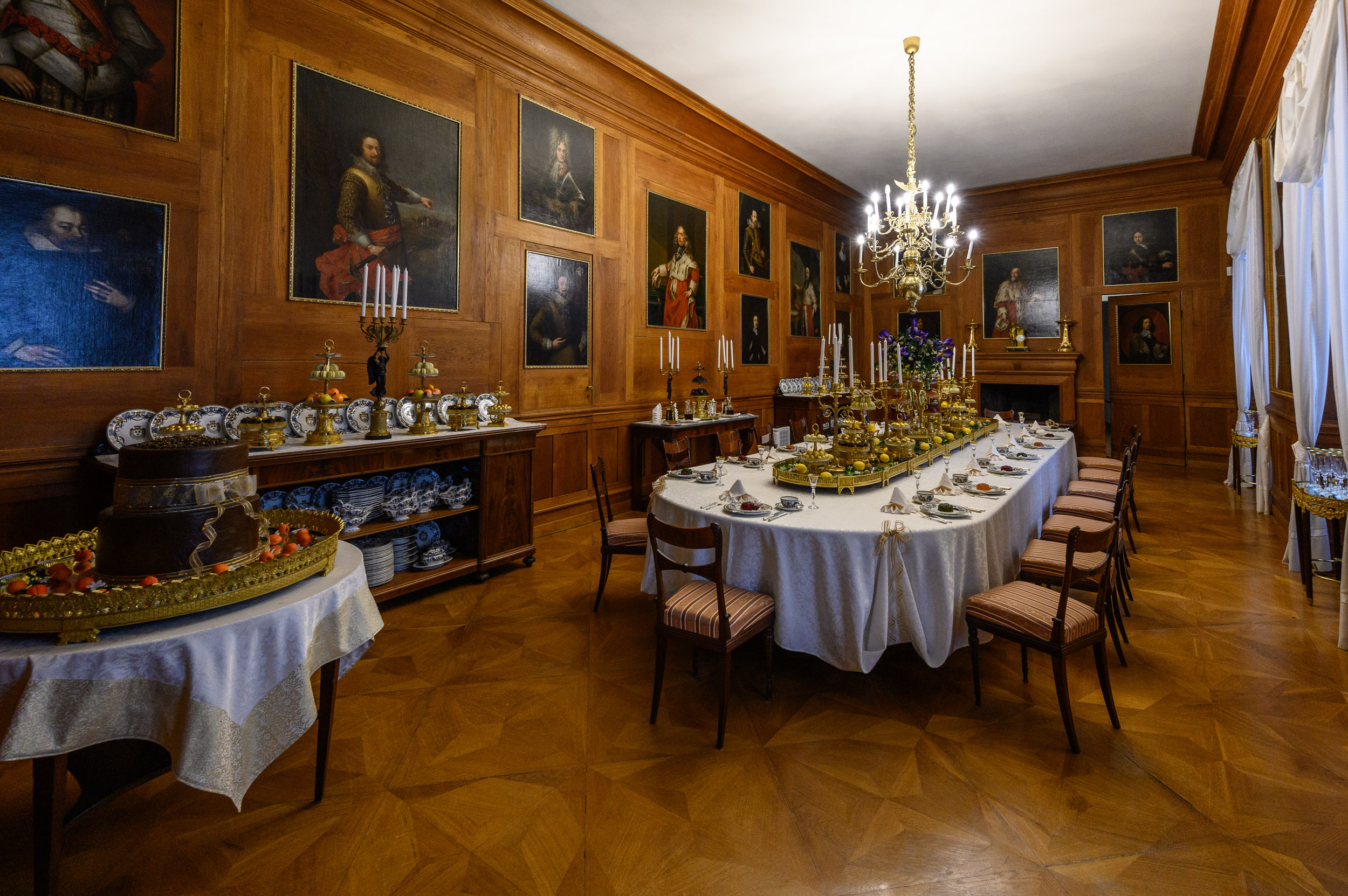 El comedor principal del palacio de Kynžvart, con una estatua de Eros y Psique proveniente del taller del gran escultor Antonio Cánova.