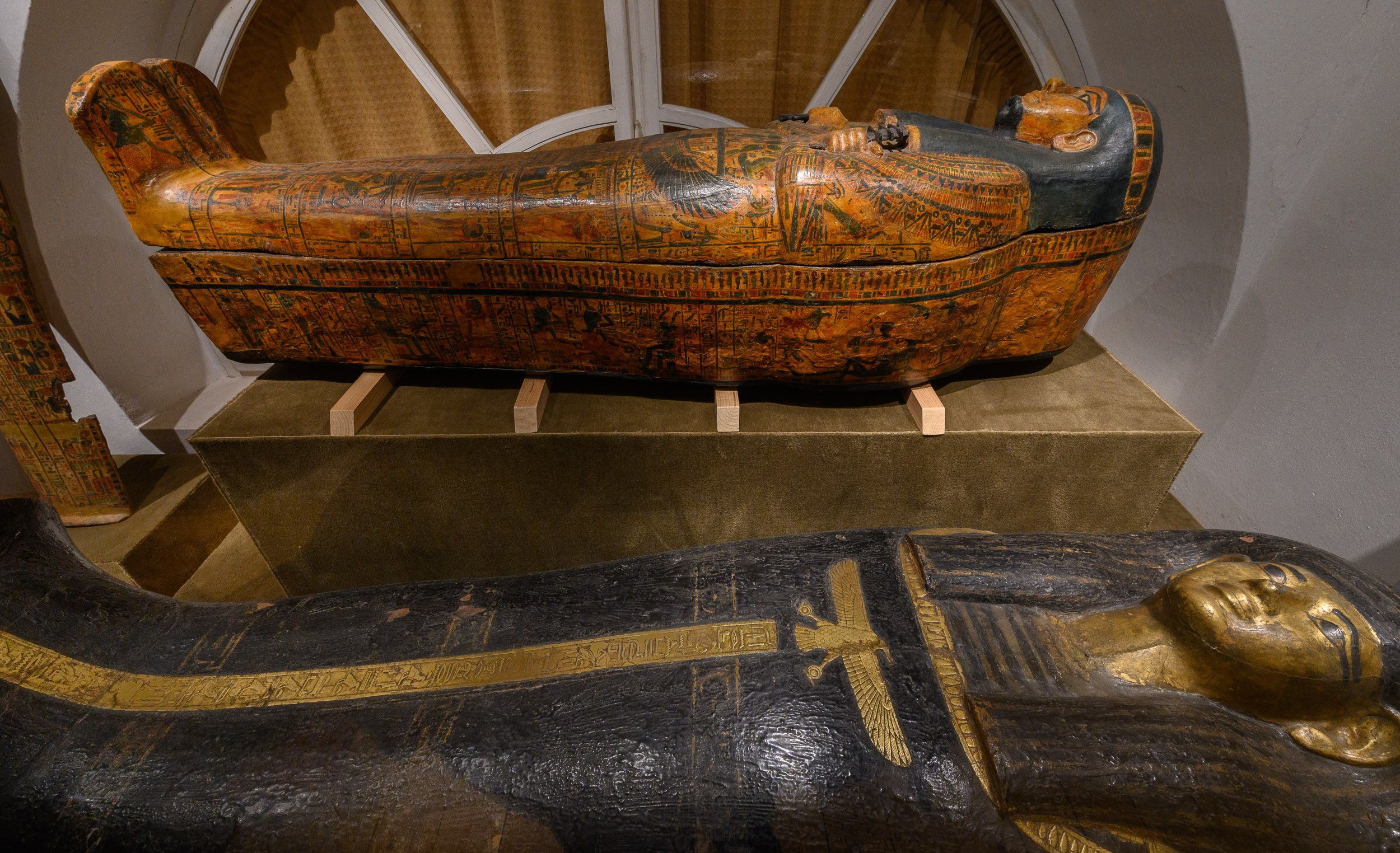 Sarcófagos egipcios que son parte de la insólita colección del palacio.