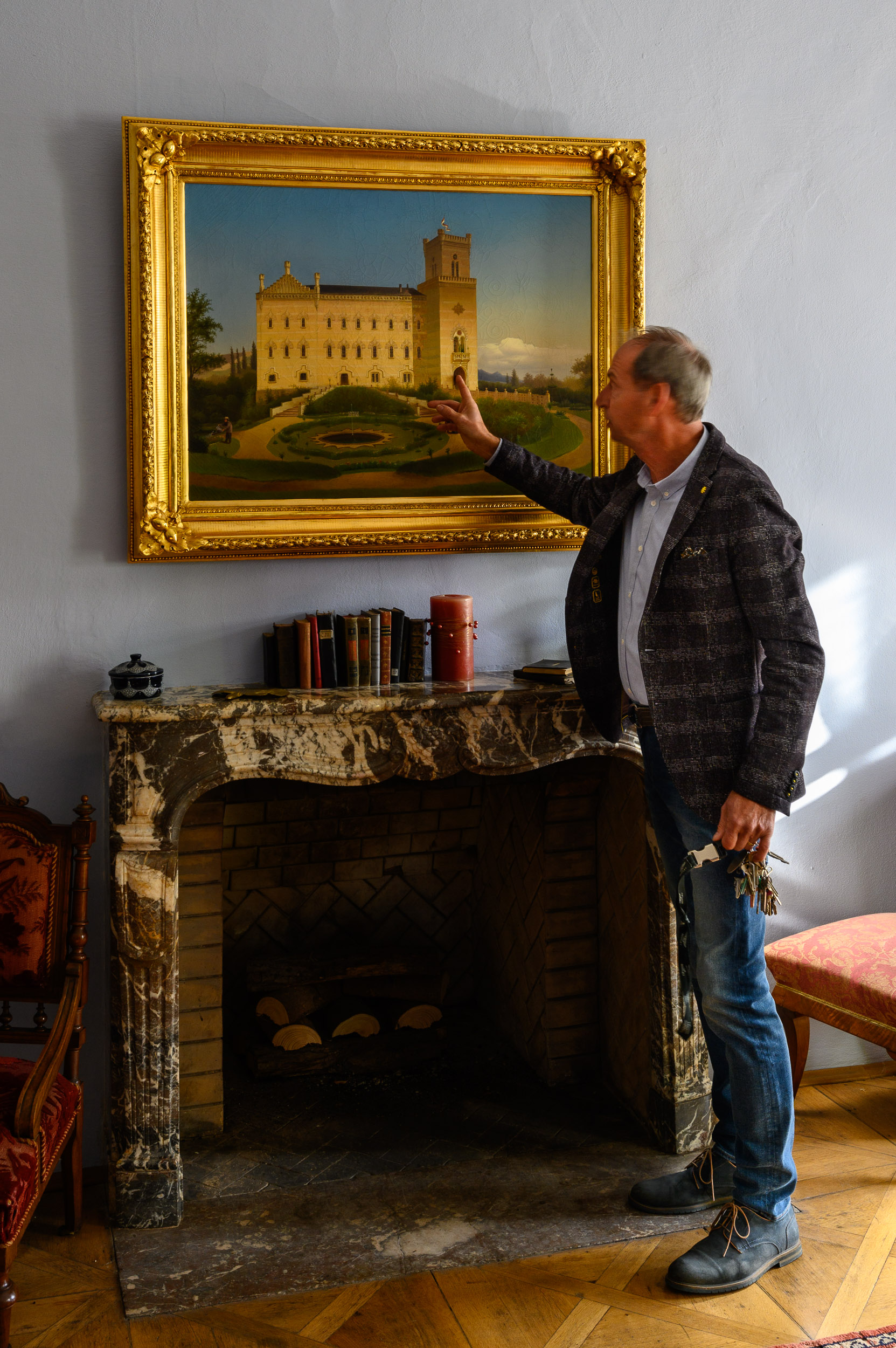 El actual propietario del castillo Chyse ante un cuadro en el que puede verse el propio palacio.