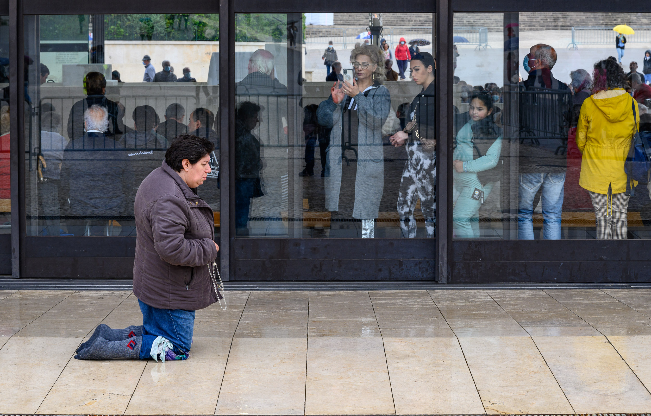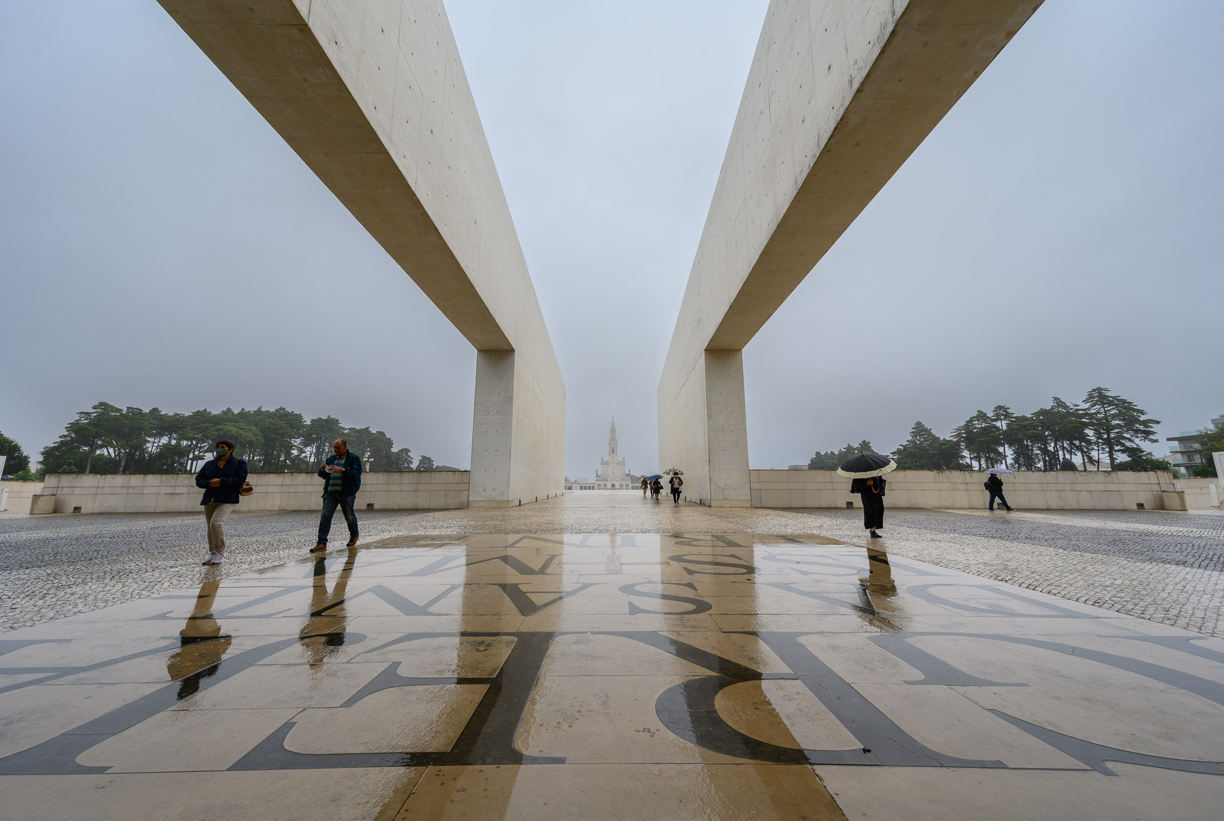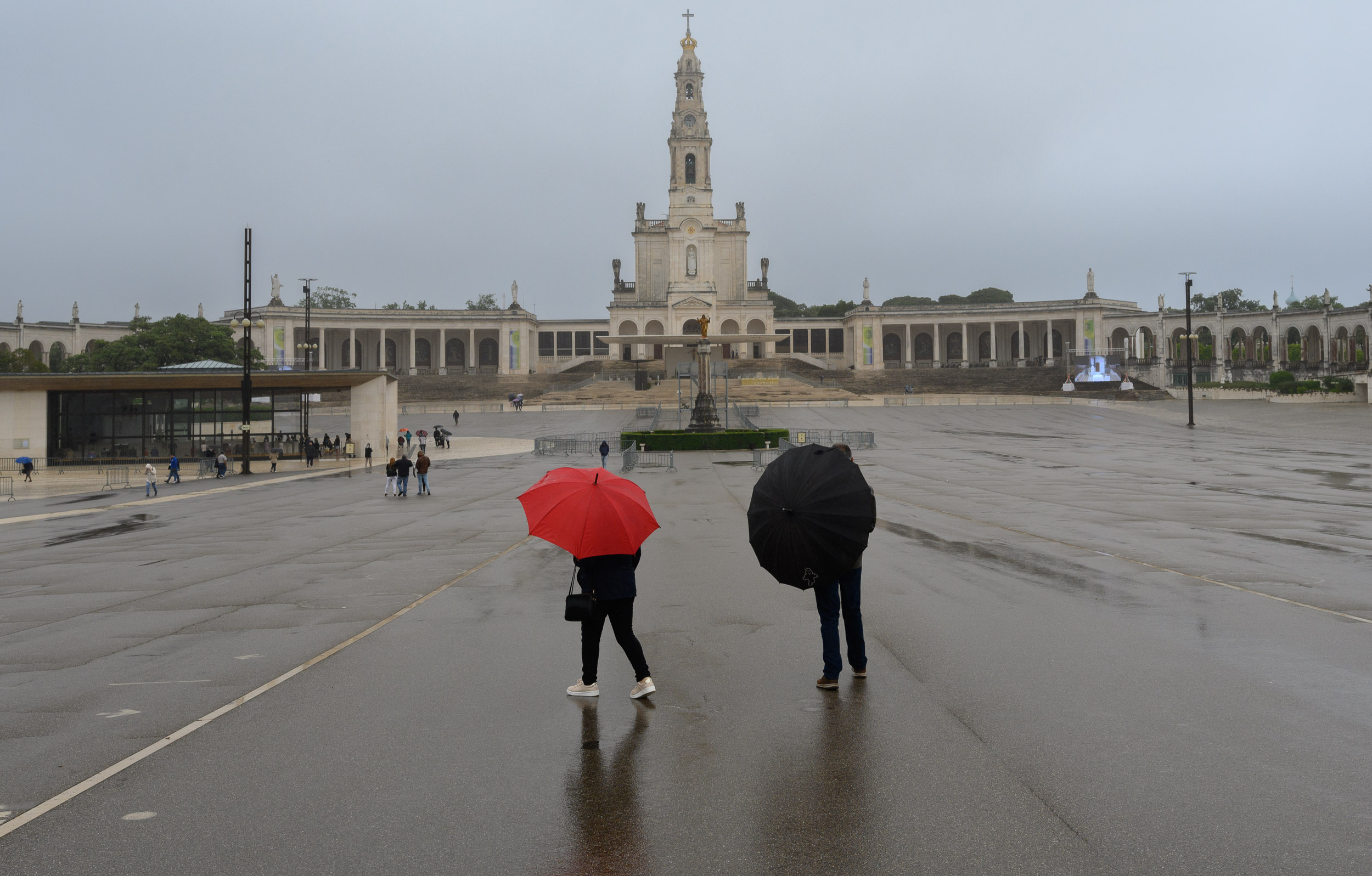 Dos visitantes en un día de lluvia en el Santuario de Fátima.