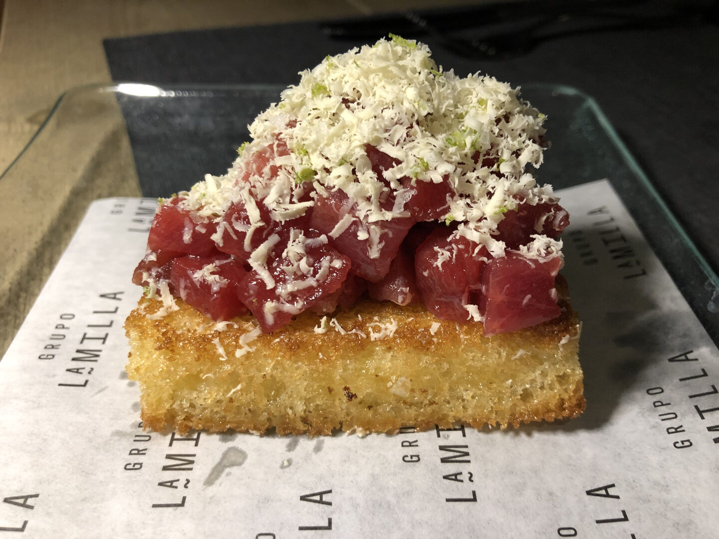 De la cocina llega también la ensaladilla de atún rojo con emulsión de piparra (29€), con dos elaboraciones de atún, uno con el pescado crudo y otro sellado a la plancha y con más sabor que el primero.