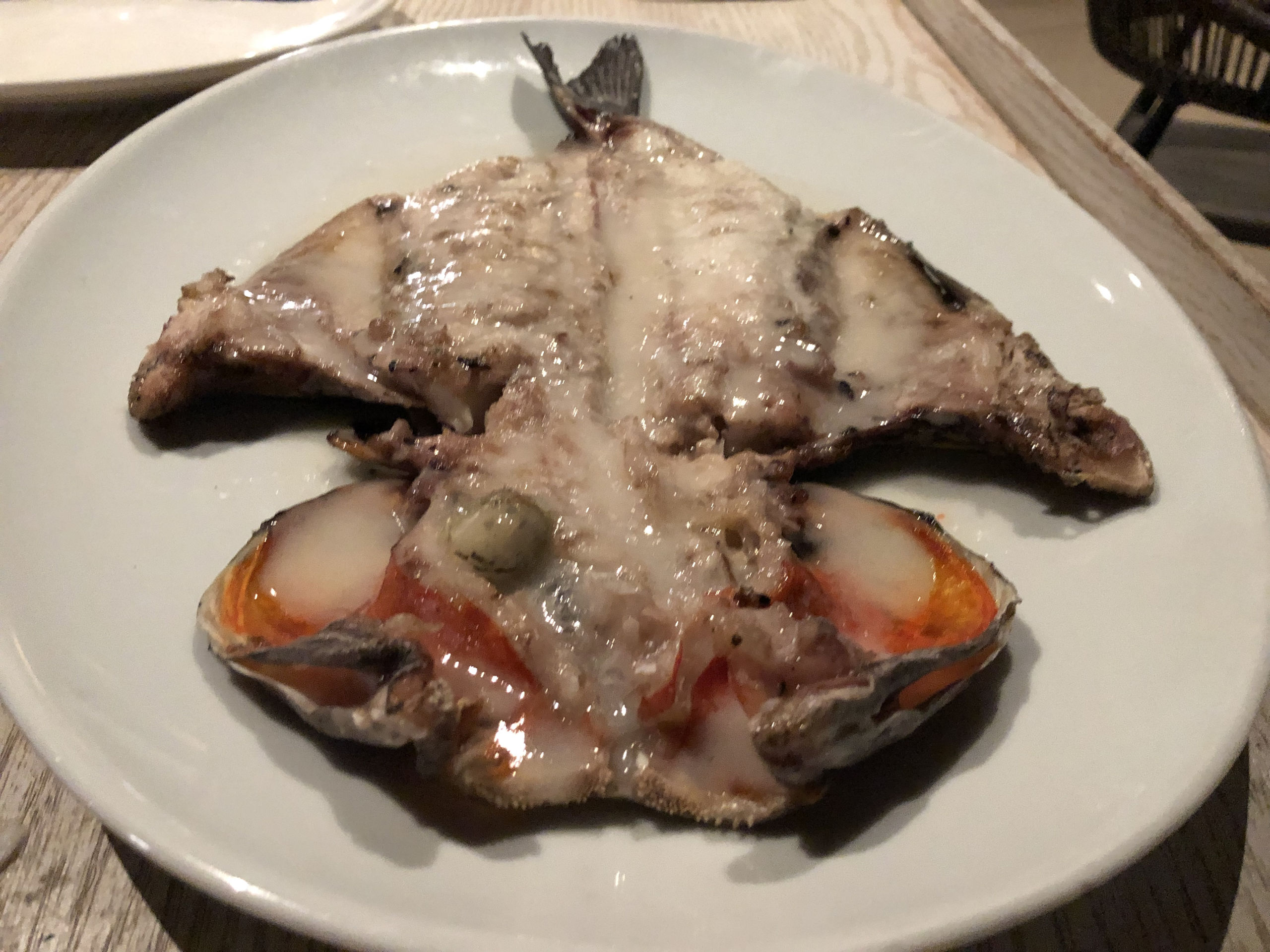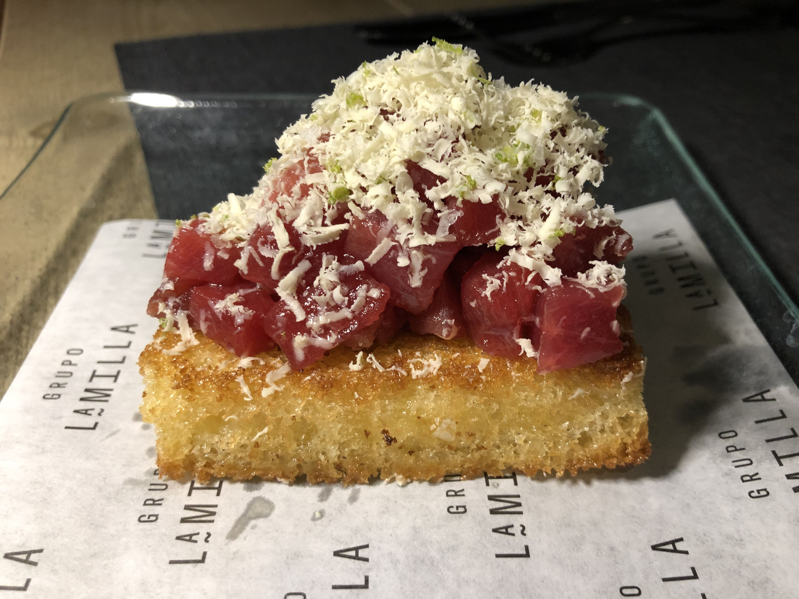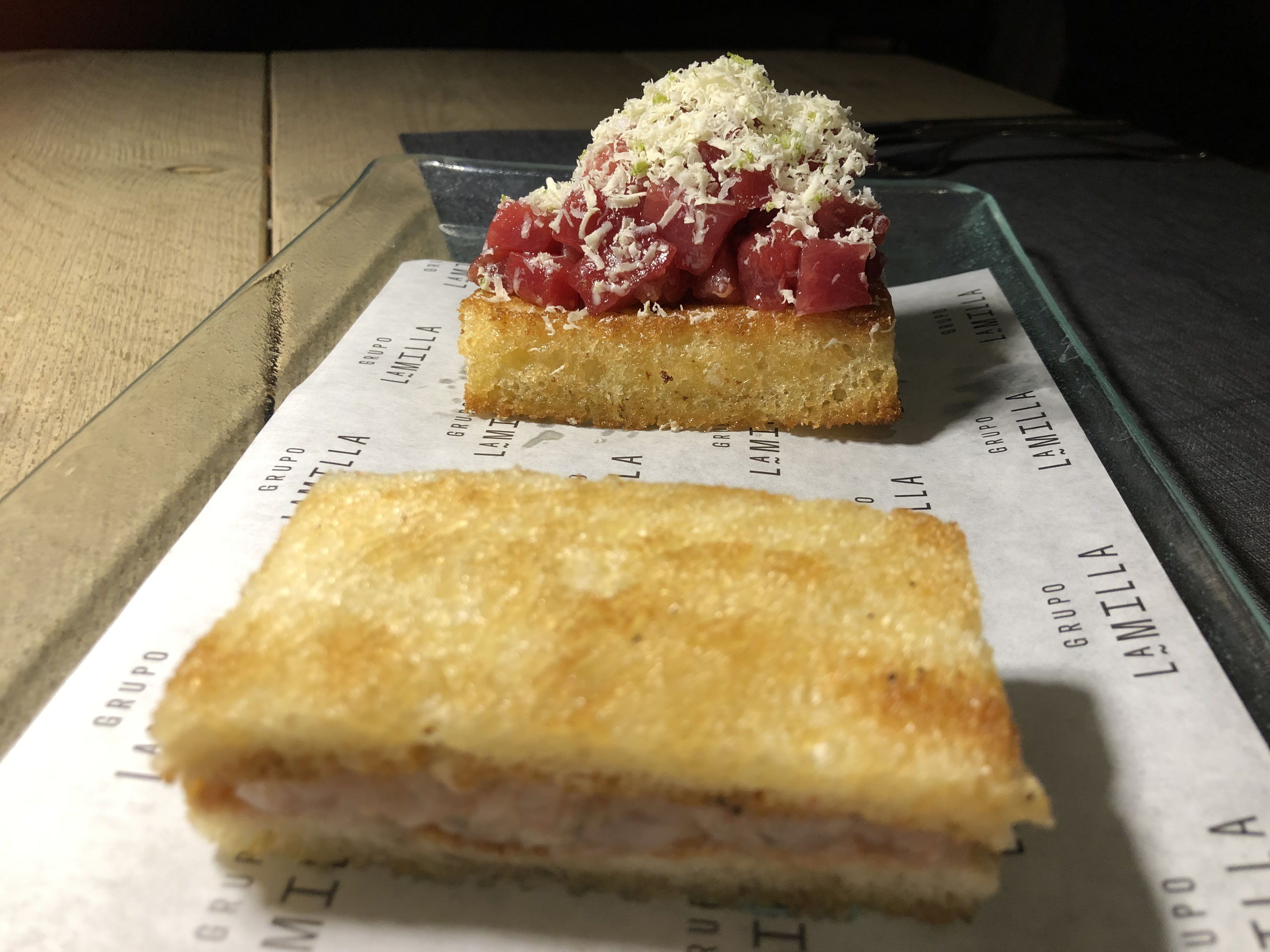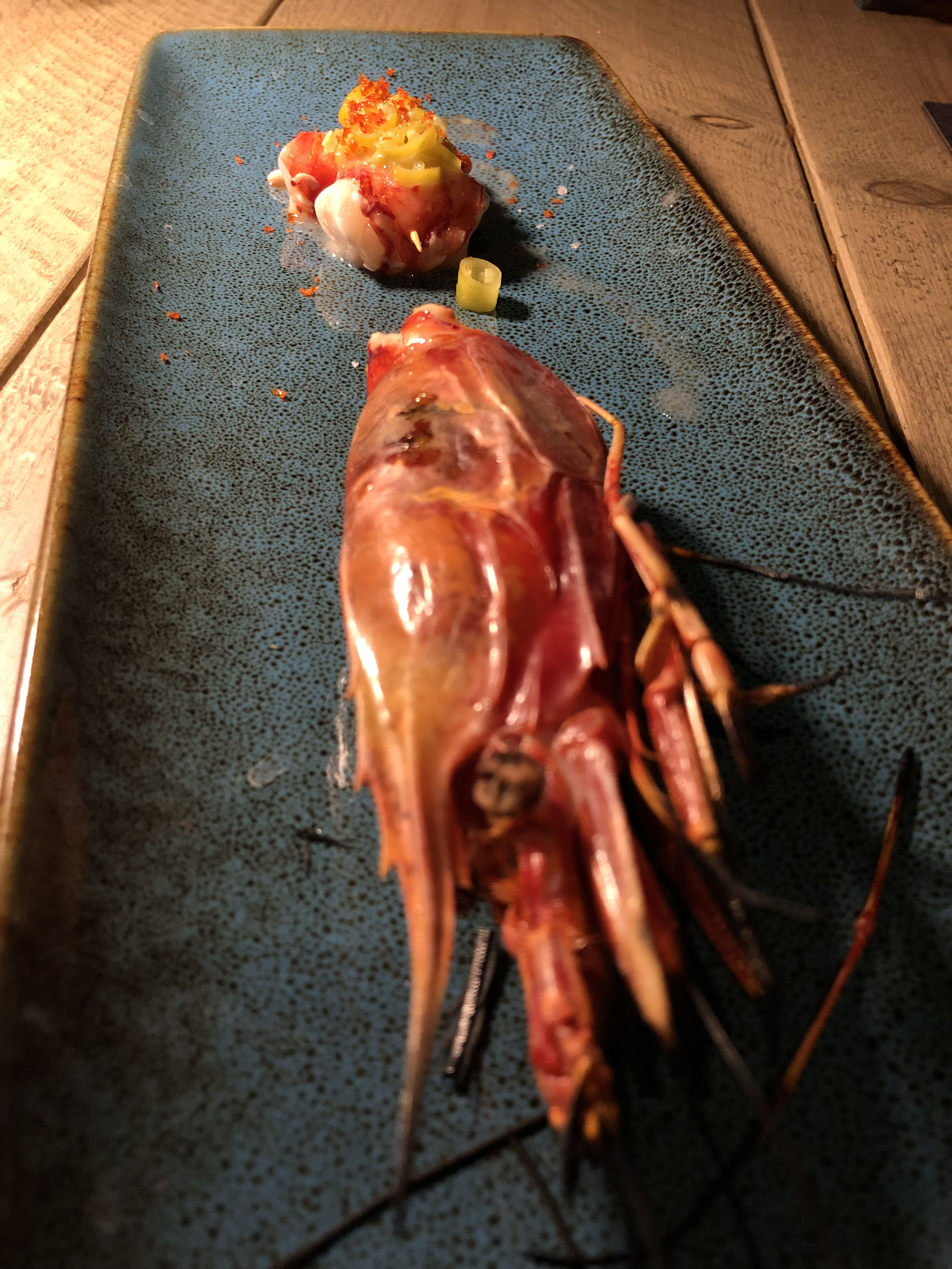 Como decimos la carta está basada en el producto fresco y la cocina moderna, por eso Luismi, chef ejecutivo y copropietario de La Milla, apuesta por una cocina de mercado en busca de la excelencia gracias a la calidad de la materia prima que encuentra en las lonjas. Del mercado llega una inconmensurable banderilla de carabinero (28€) y creo que me quedo corto. Empiezas comiéndote una parte de la cola para a continuación chupar la cabeza y su jugo. Después lo que se sobra lo echas por encima del resto de cola que te queda en la banderilla y sigues disfrutando de este maravilloso bocado.
